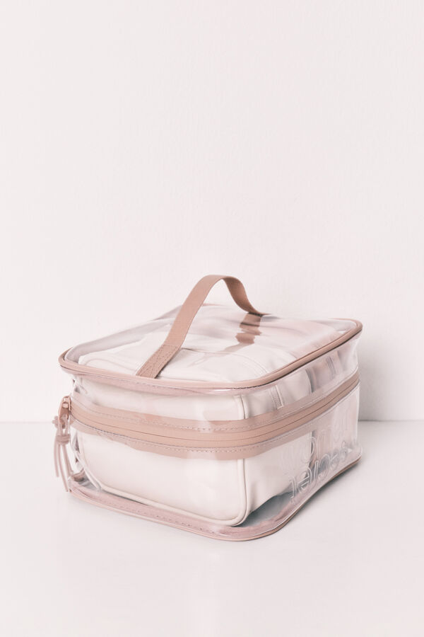 Neceser grande transparente con cremallera y bordes a contraste y dos neceseres pequeños de goma en su interior, con cremallera. El pack perfecto para tener todos tus básicos beauty bien ordenados.
