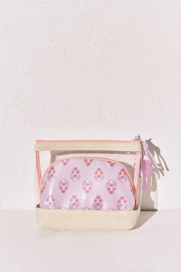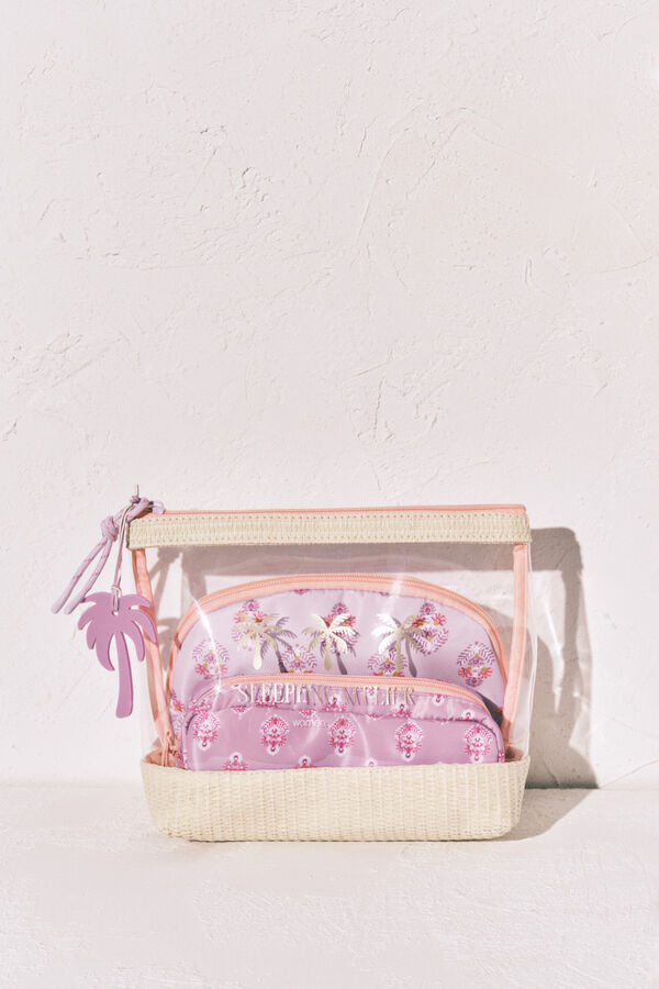 Pack 3 neceseres: uno más grande tipo estuche, transparente con detalles efecto rafia, que contiene en su interior otros dos con estampado de flores. Perfectos para organizar todos tus básicos beauty por secciones.