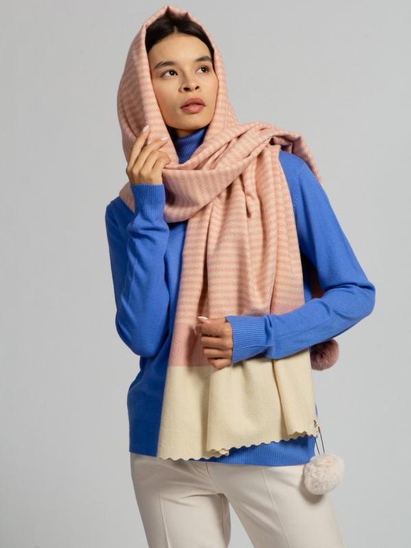 Большой, мягкий, теплый двусторонний палантин с рисунком в стиле арт-деко. Края изделия украшены съемными помпонами из меха кролика. Только ручная стирка.