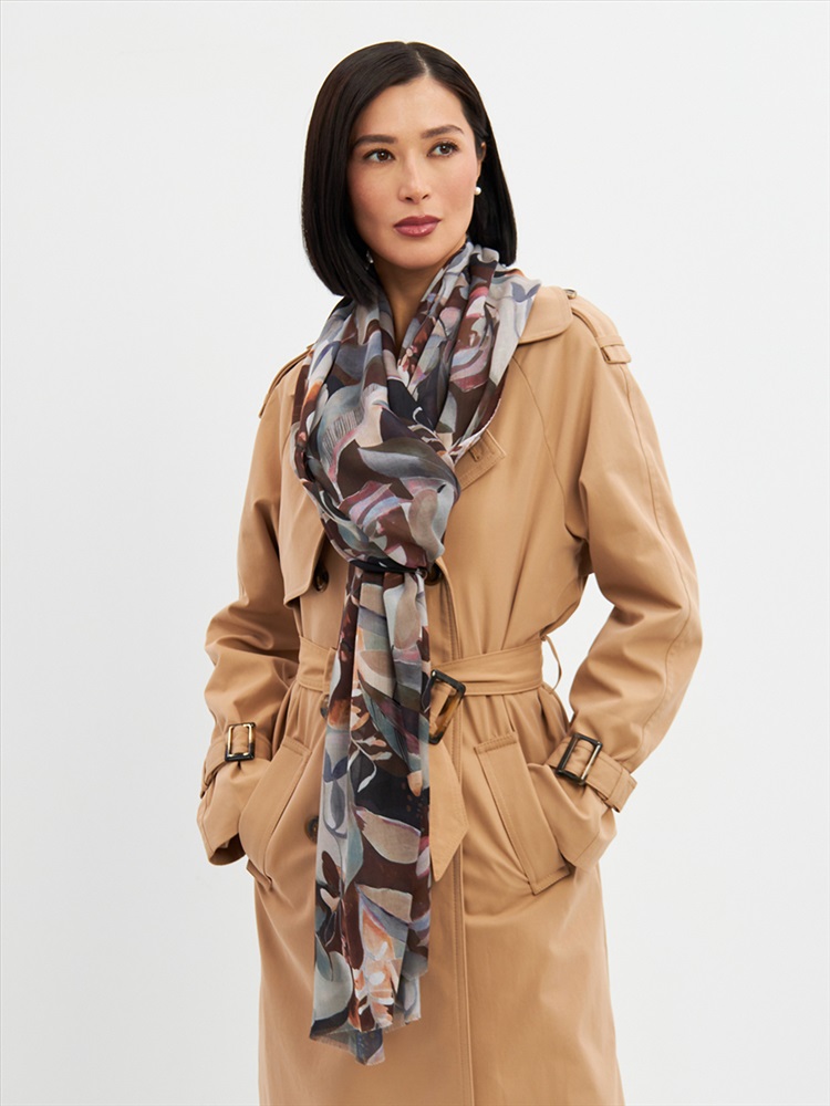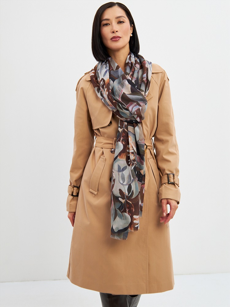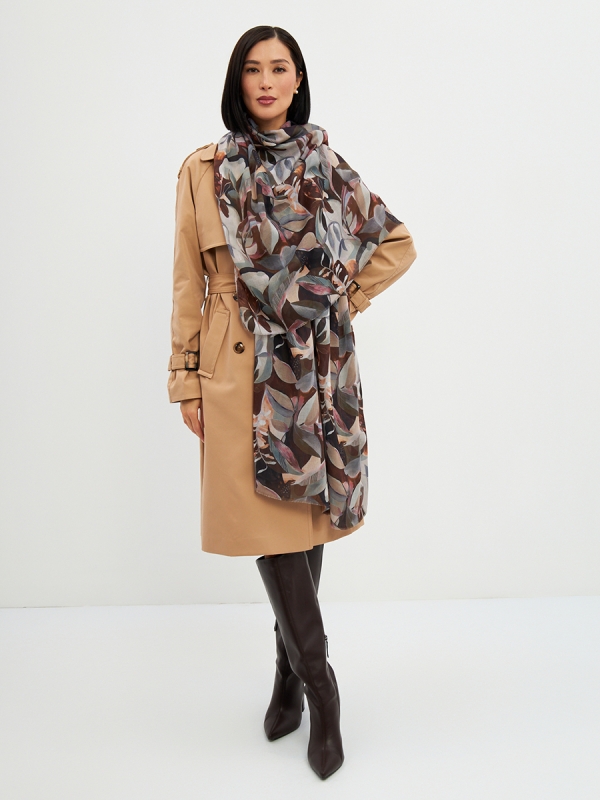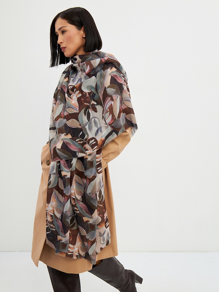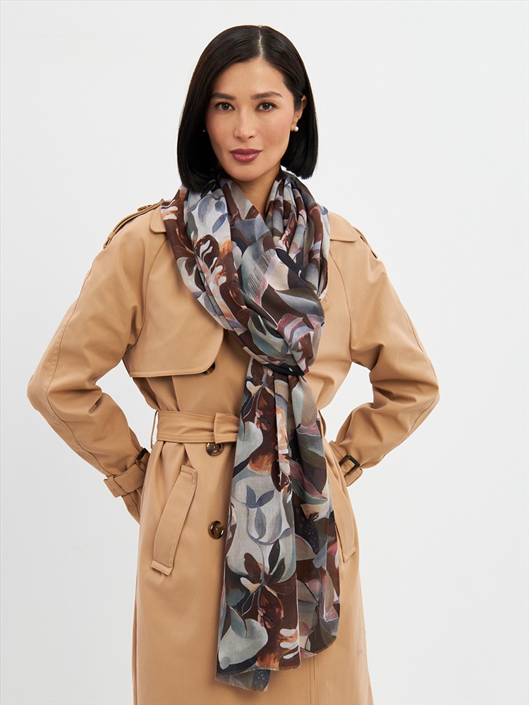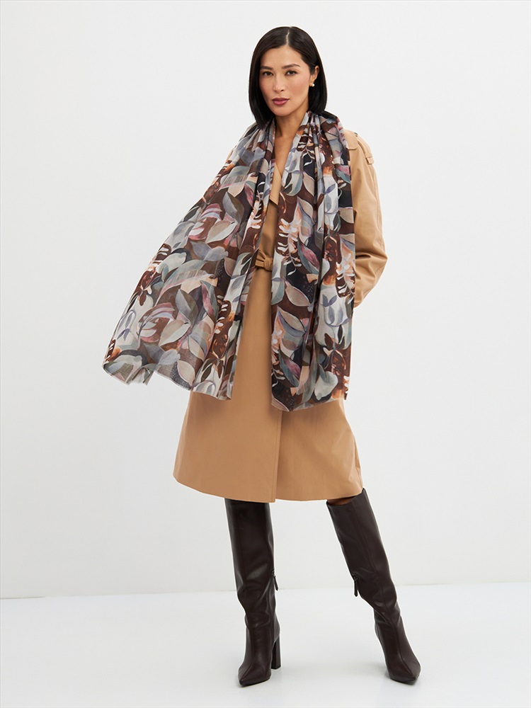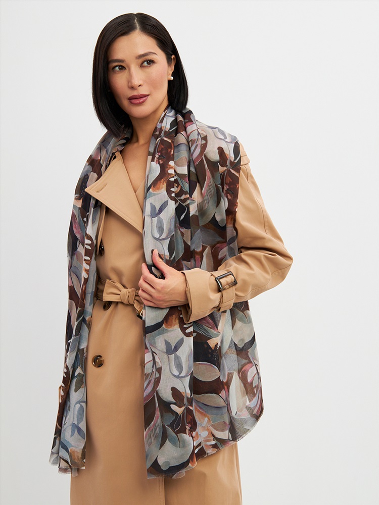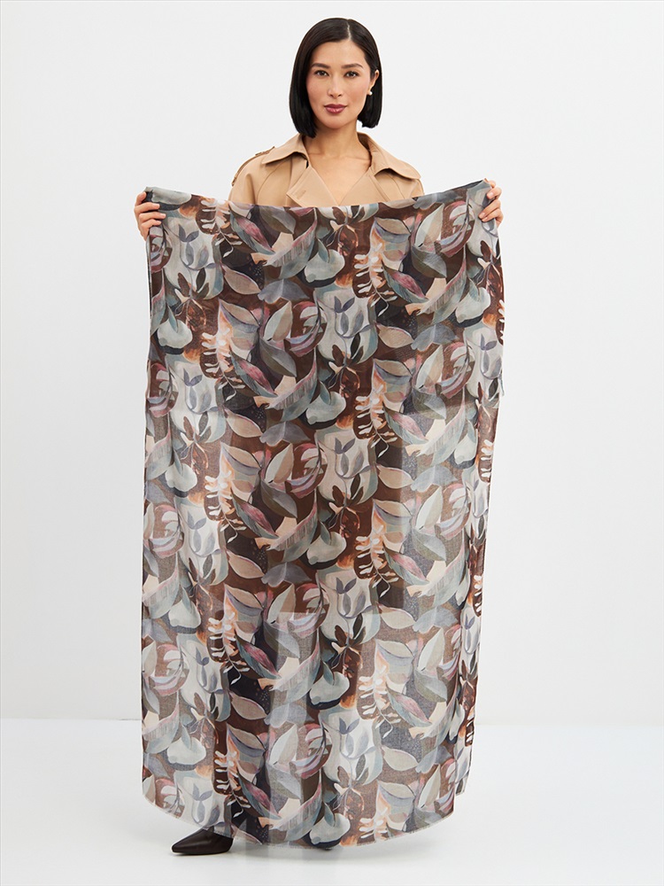 Цвет: Коричневый, Светло-серый Размер: 80 x 180 см Состав: 55% полиэстер, 35% вискоза, 10% шелк Состав: Вискоза, Полиэстер, Шелк Принт: Цветочный Большой, мягкий, тонкий и очень нежный палантин с рисунком. Края изделия украшены бахромой ручной работы. Машинная деликатная стирка. Комментарии к товару