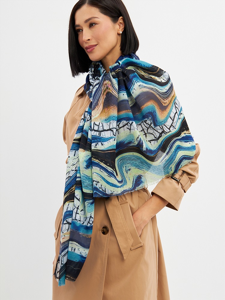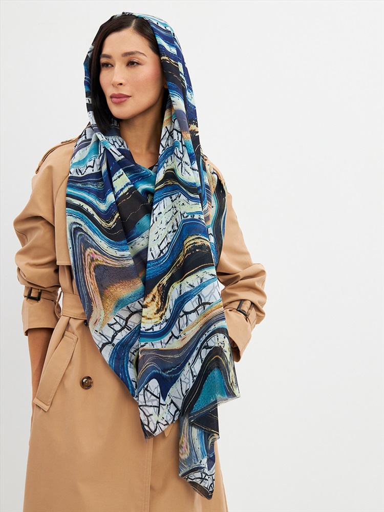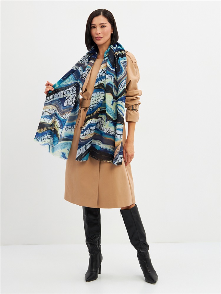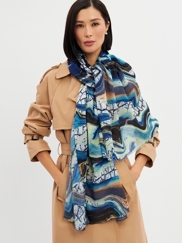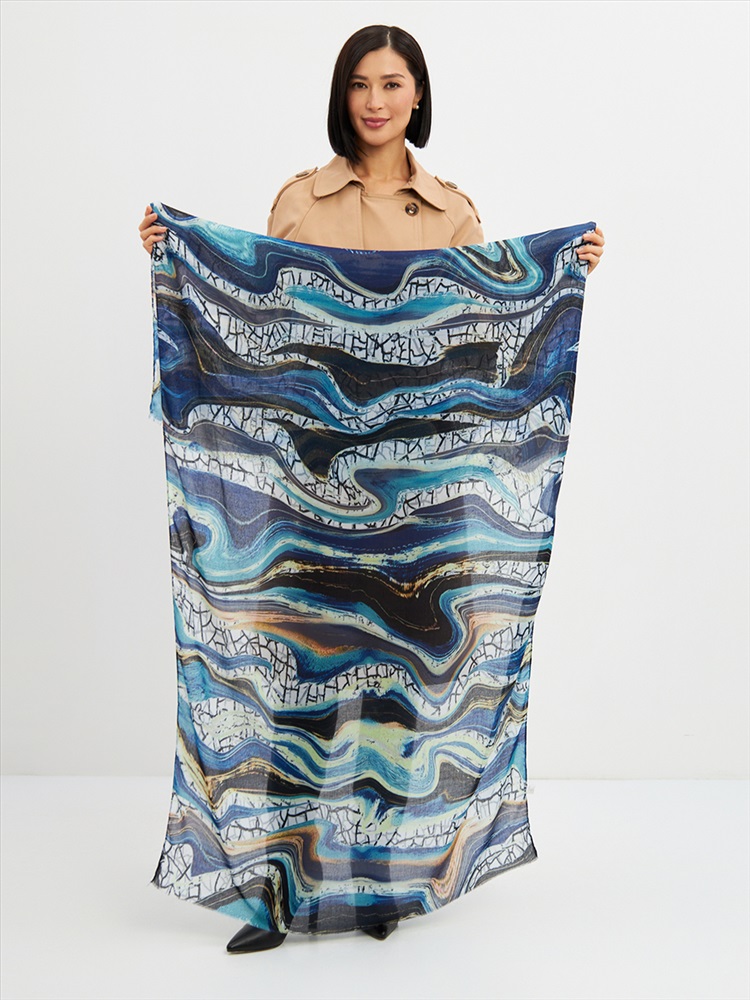 Цвет: Бирюзовый, Голубой, Графит Размер: 80 x 180 см Состав: 55% полиэстер, 35% вискоза, 10% шелк Состав: Вискоза, Полиэстер, Шелк Принт: Абстракция Большой, мягкий, тонкий и очень нежный палантин с рисунком. Края изделия украшены бахромой ручной работы. Машинная деликатная стирка. Комментарии к товару