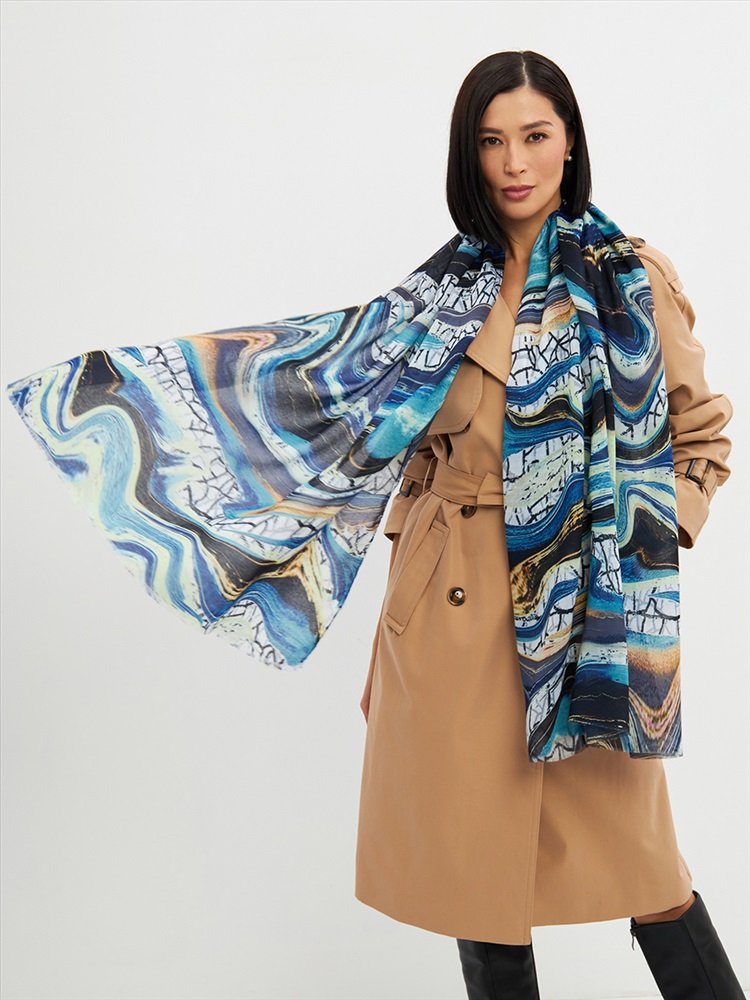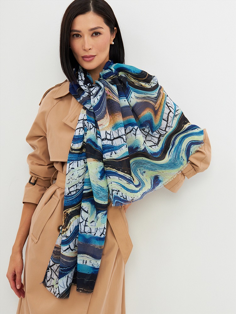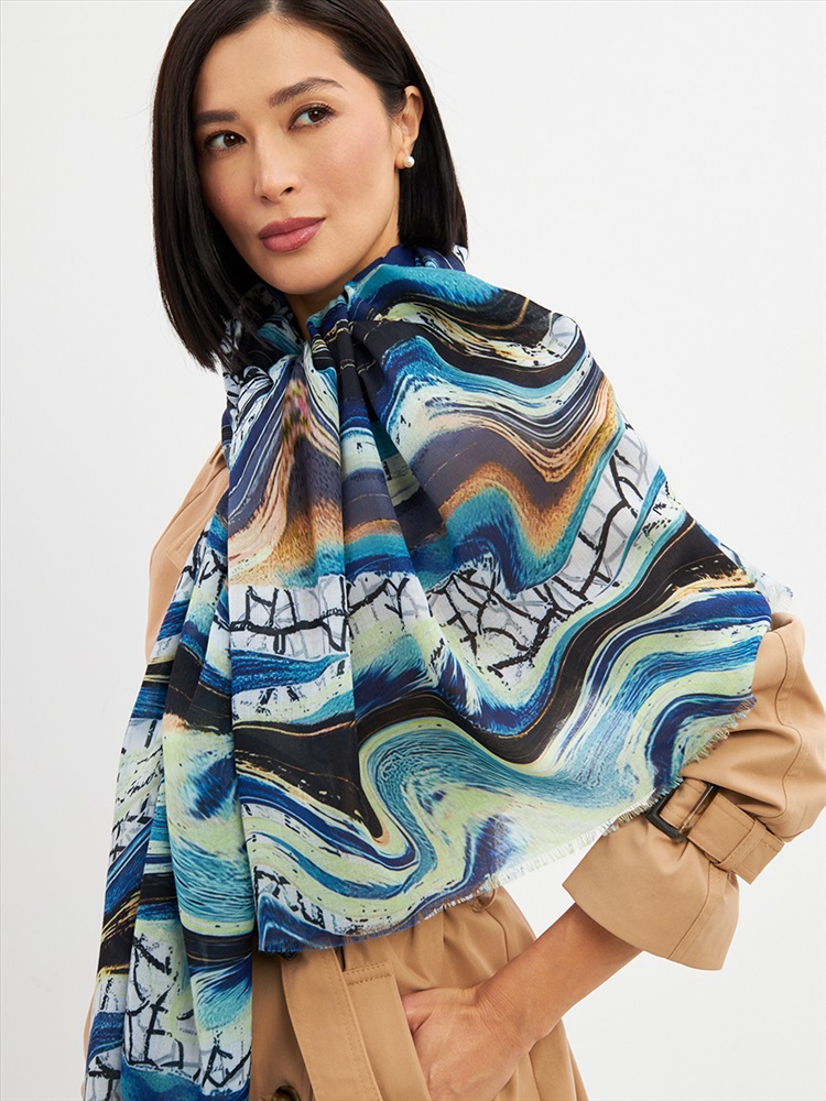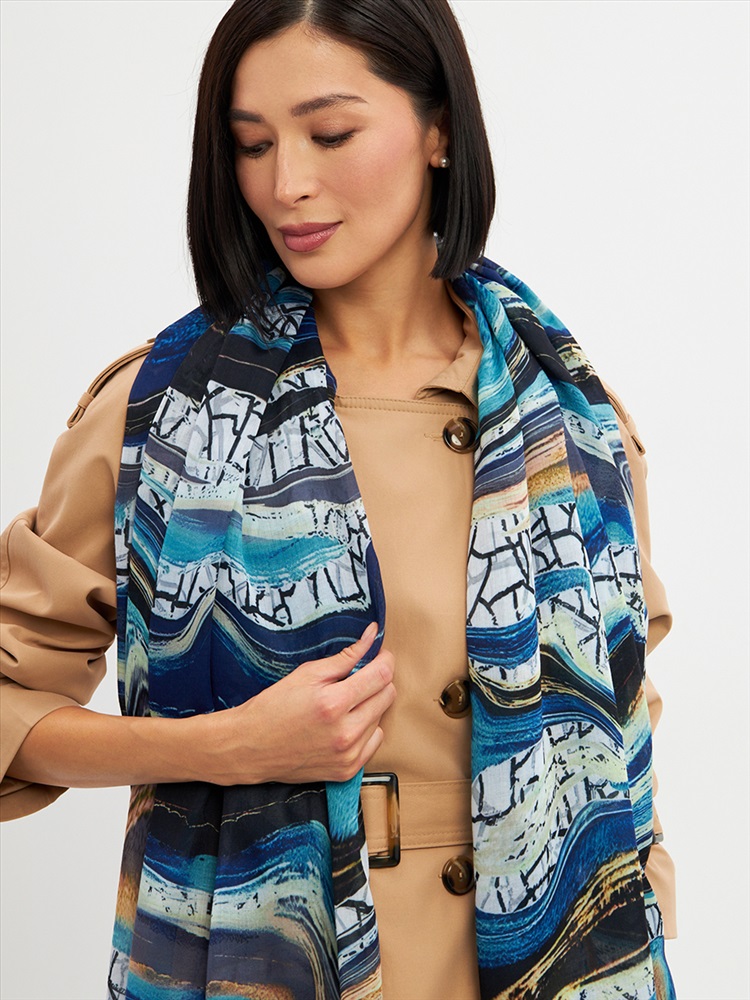 Цвет: Бирюзовый, Голубой, Графит Размер: 80 x 180 см Состав: 55% полиэстер, 35% вискоза, 10% шелк Состав: Вискоза, Полиэстер, Шелк Принт: Абстракция Большой, мягкий, тонкий и очень нежный палантин с рисунком. Края изделия украшены бахромой ручной работы. Машинная деликатная стирка. Комментарии к товару