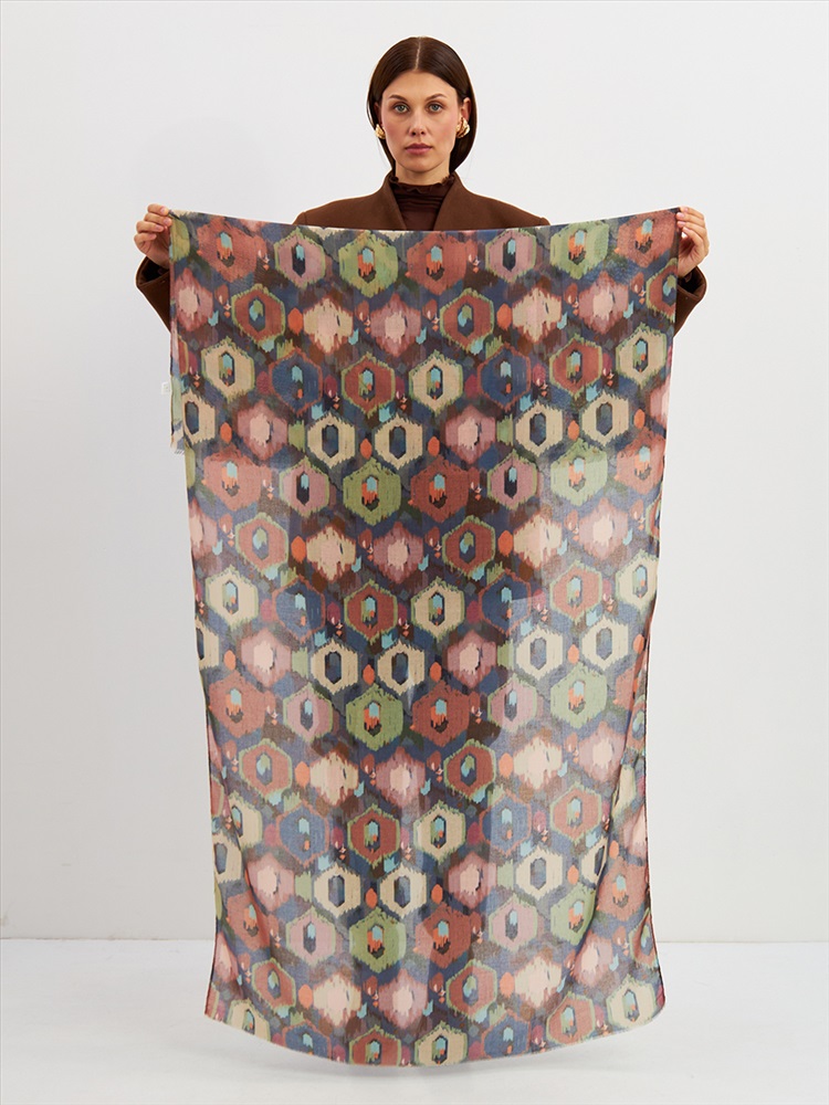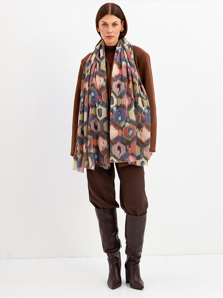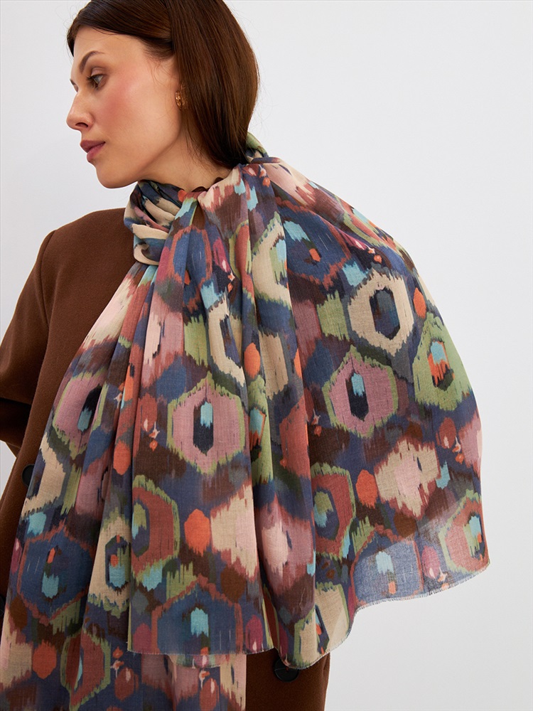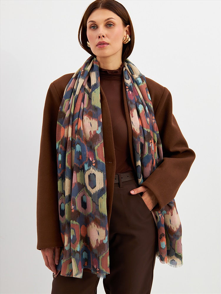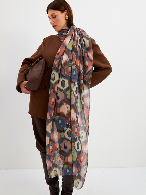 Цвет: Бежевый, Желтый, Зеленый, Коричневый Размер: 80 x 180 см Состав: 55% полиэстер, 35% вискоза, 10% шелк Состав: Вискоза, Полиэстер, Шелк Принт: Абстракция Большой, мягкий, тонкий и очень нежный палантин с рисунком. Края изделия украшены бахромой ручной работы. Машинная деликатная стирка. Комментарии к товару