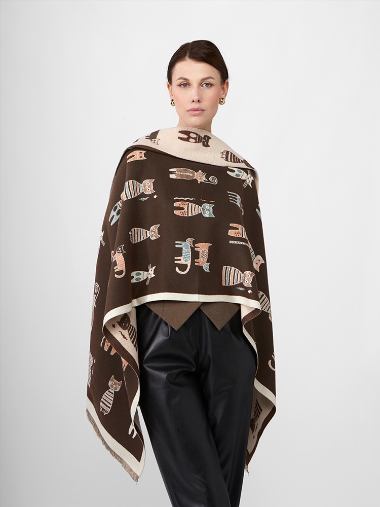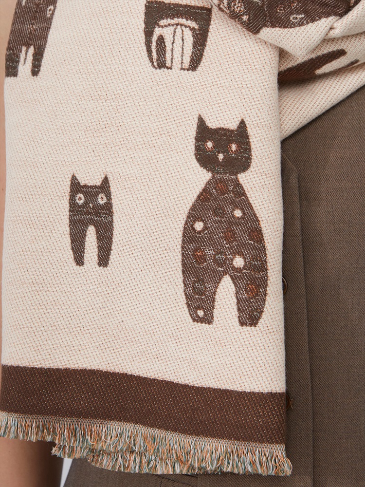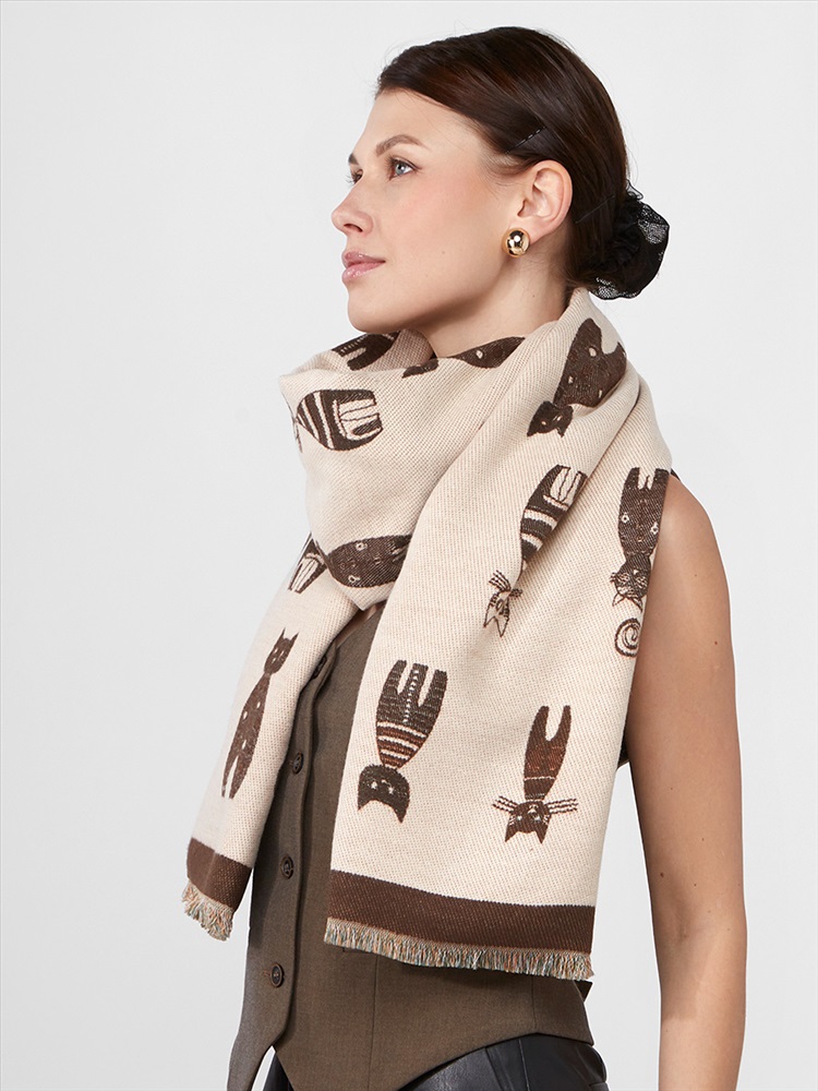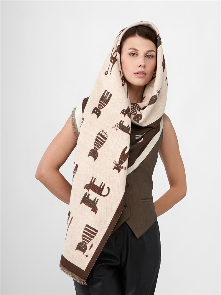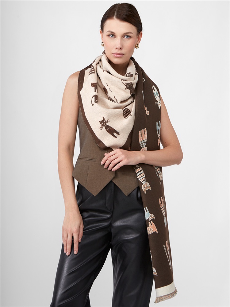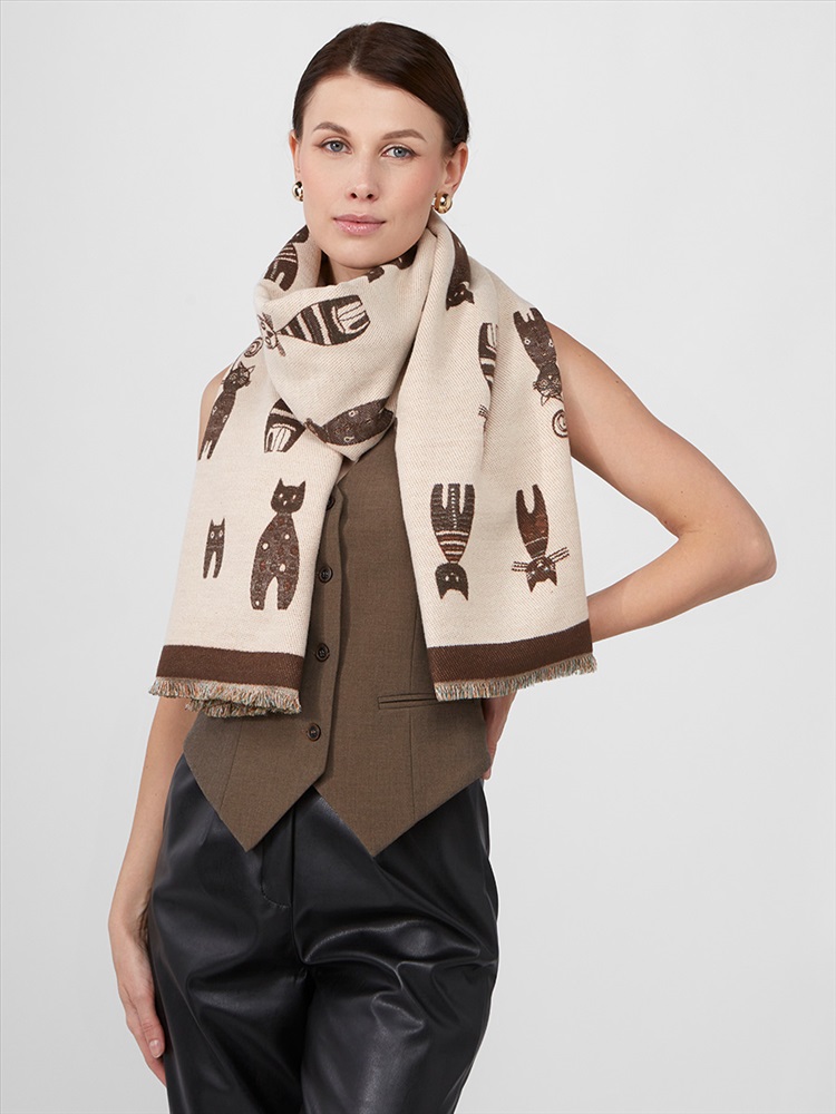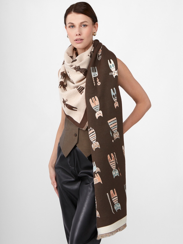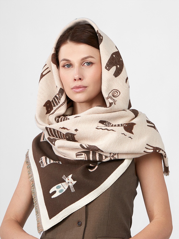 Цвет: Бежевый, Кофейный Состав: 65% модал, 20% шерсть, 15% кашемир Состав: Шерсть, Модал, Кашемир Принт: Сюжетный Размер: 65 x 180 cм Сезон: Демисезон, Осень, Весна Стиль: Повседневный Большой, мягкий, теплый двусторонний палантин. Только ручная стирка. Комментарии к товару