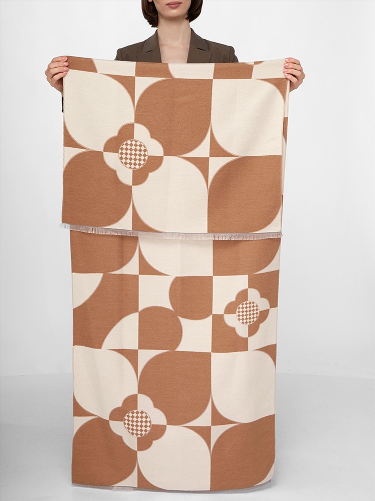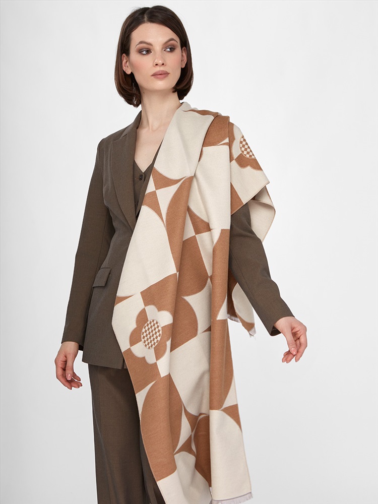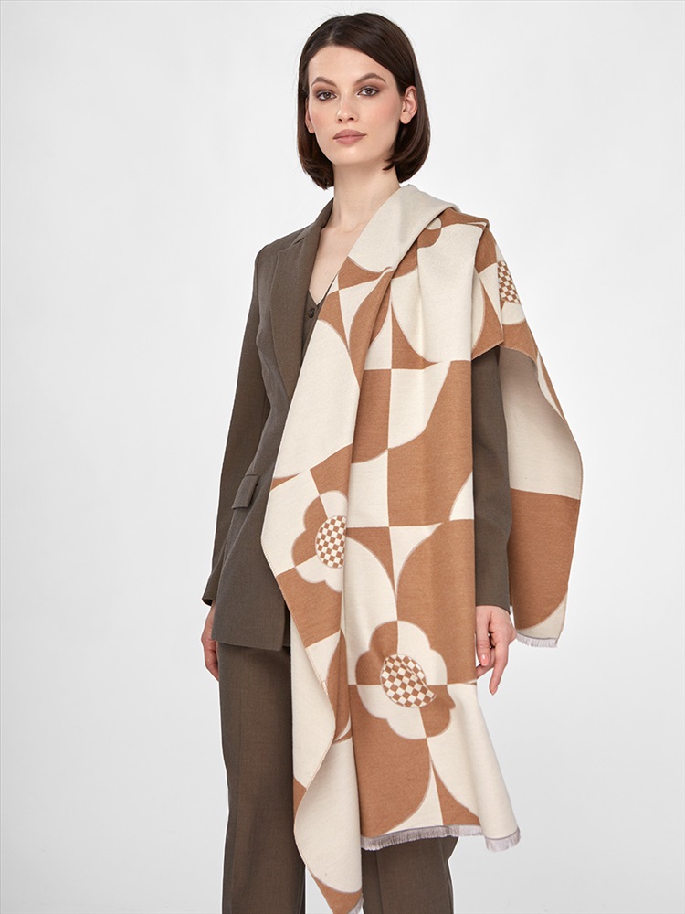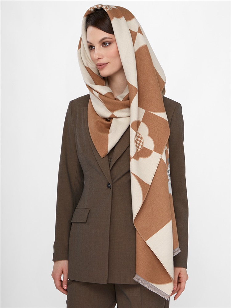 Цвет: Бежевый, Коричневый Состав: 45% модал, 20% вискоза, 20% шерсть, 15% кашемир Состав: Вискоза, Шерсть, Модал, Кашемир Принт: Абстракция Размер: 65 х 180 см Сезон: Осень, Зима Стиль: Повседневный Большой, мягкий, теплый однотонный двусторонний палантин. Только ручная стирка. Комментарии к товару