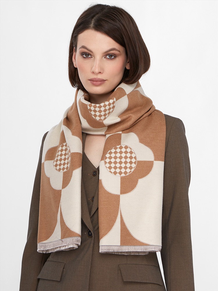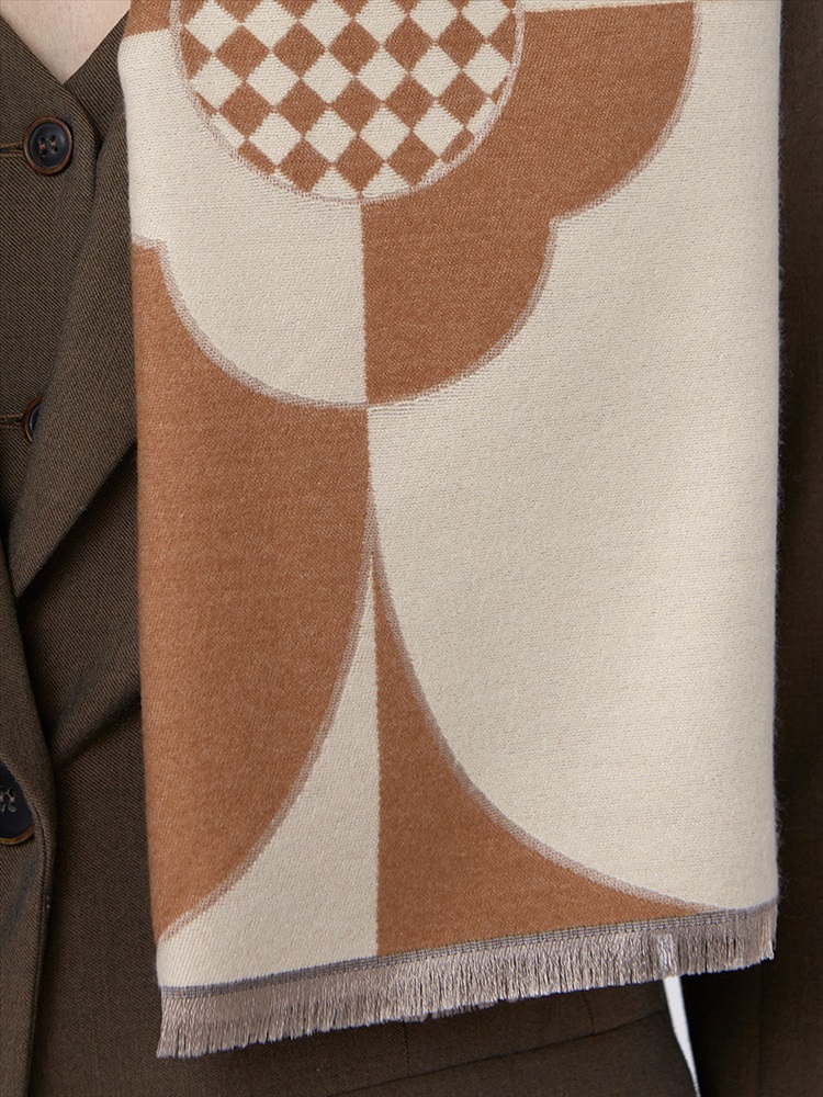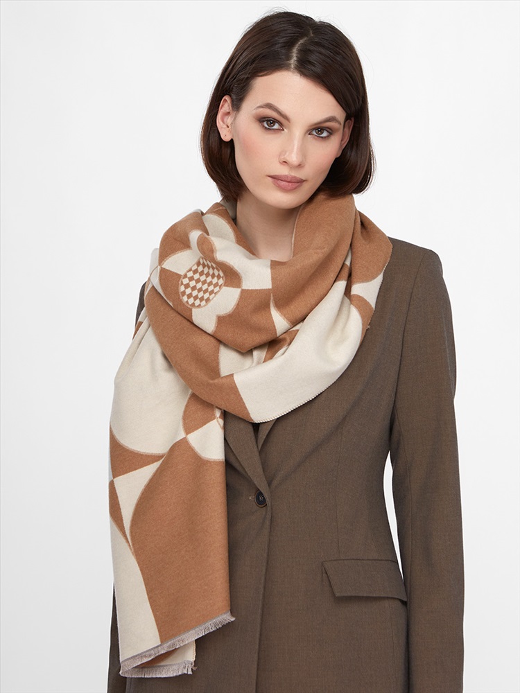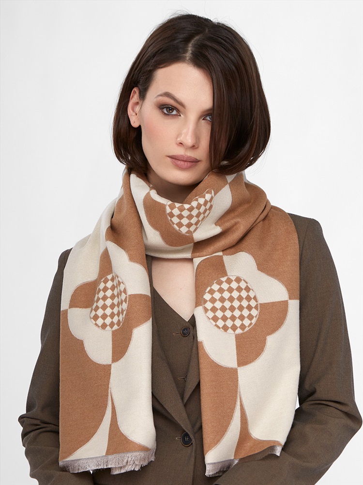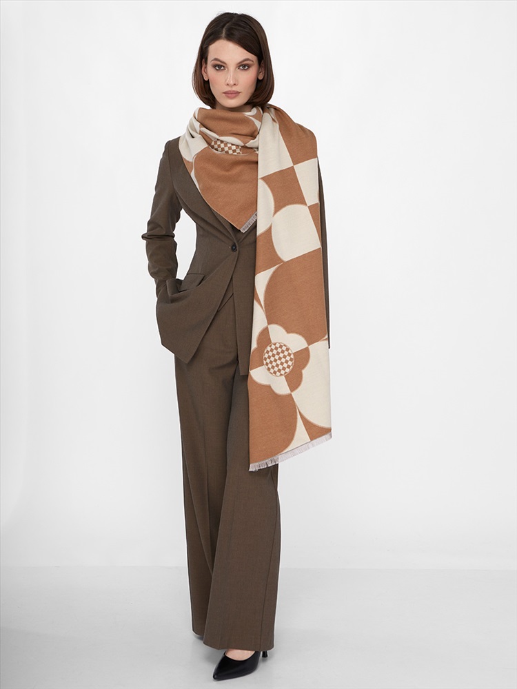 Цвет: Бежевый, Коричневый Состав: 45% модал, 20% вискоза, 20% шерсть, 15% кашемир Состав: Вискоза, Шерсть, Модал, Кашемир Принт: Абстракция Размер: 65 х 180 см Сезон: Осень, Зима Стиль: Повседневный Большой, мягкий, теплый однотонный двусторонний палантин. Только ручная стирка. Комментарии к товару
