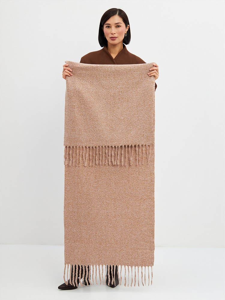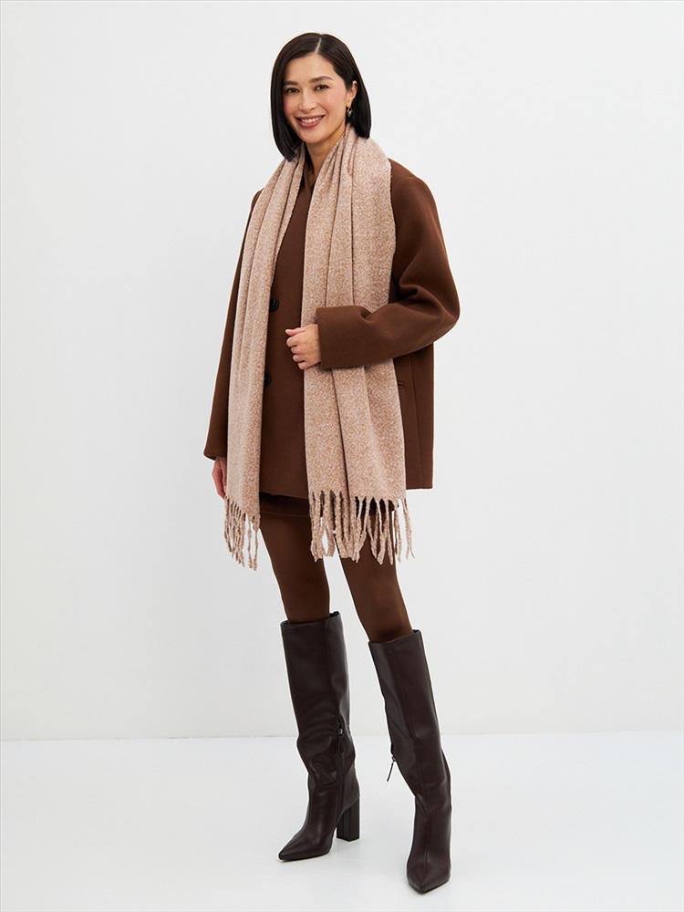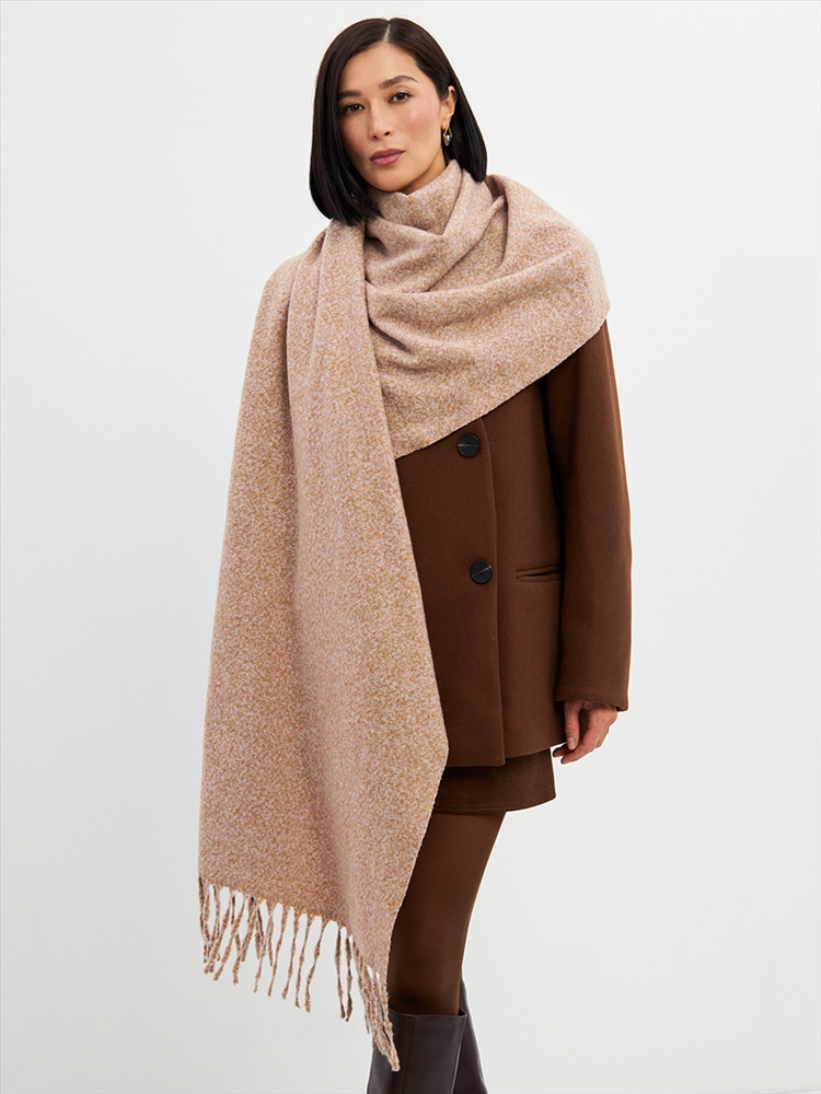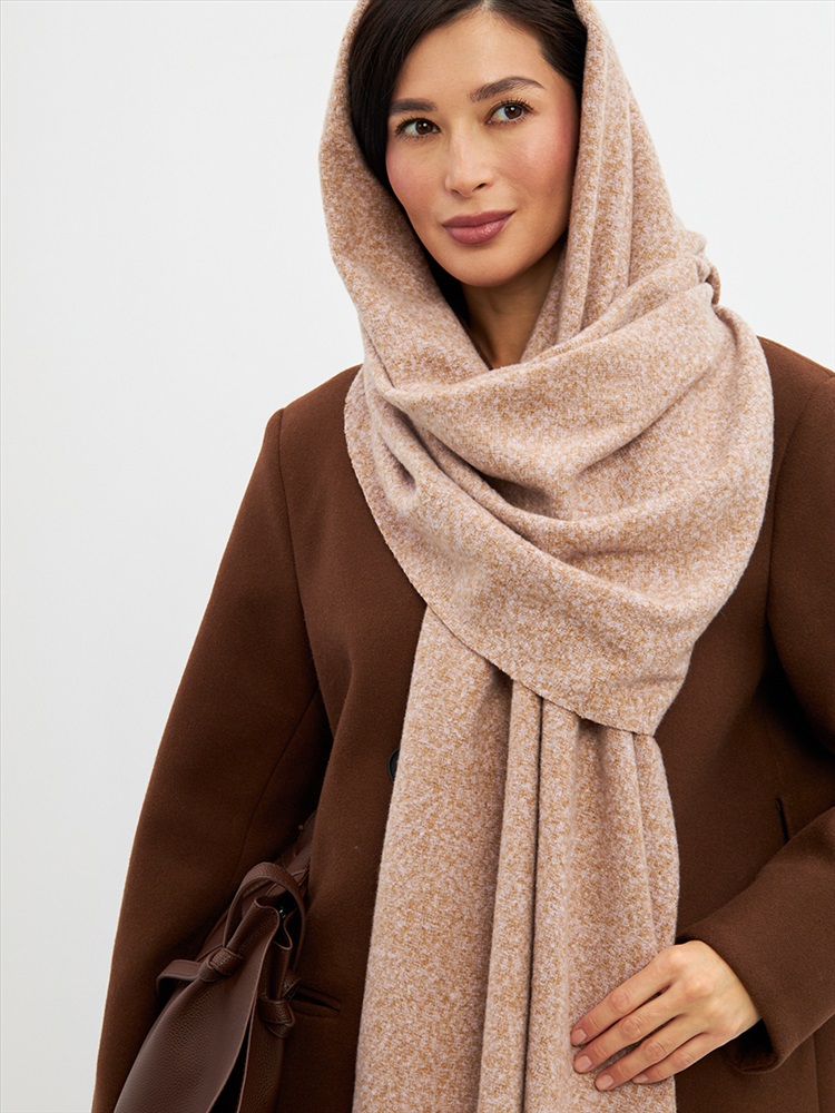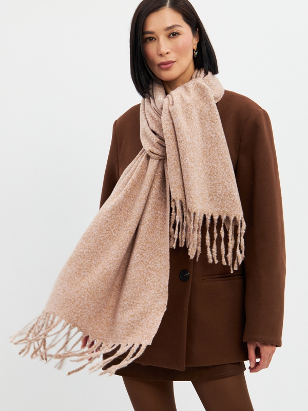 Размер: 180 x 70 см Большой, мягкий, теплый двусторонний однотонный меланжевый палантин. Края изделия украшены бахромой. Машинная деликатная стирка.