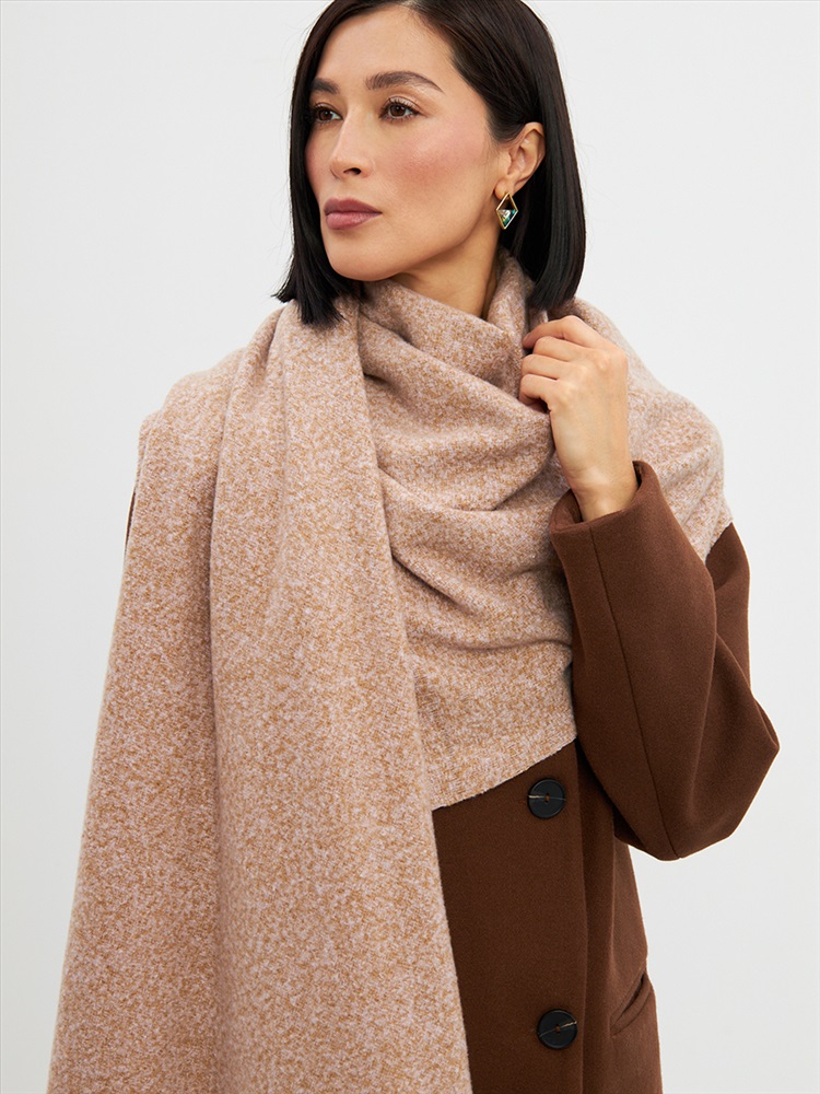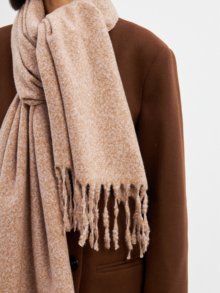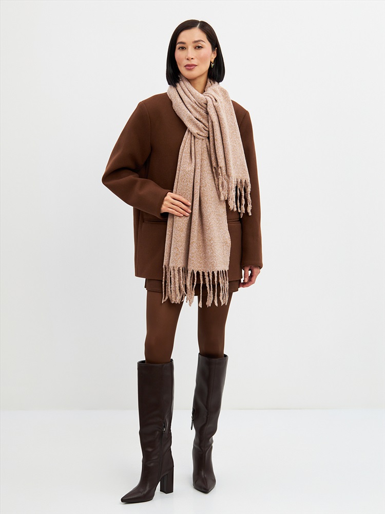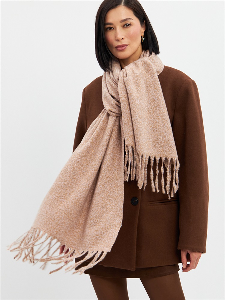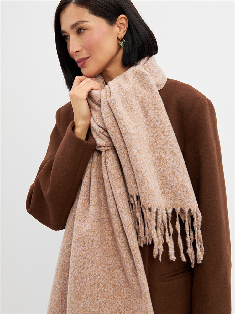 Размер: 180 x 70 см Большой, мягкий, теплый двусторонний однотонный меланжевый палантин. Края изделия украшены бахромой. Машинная деликатная стирка.