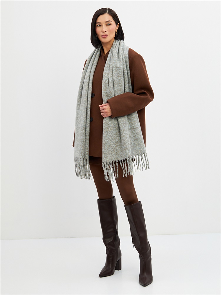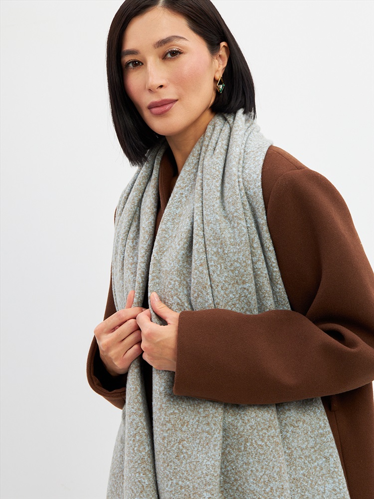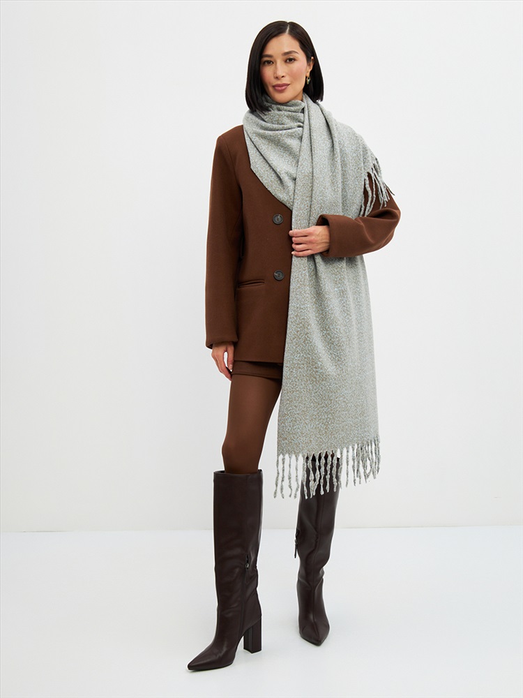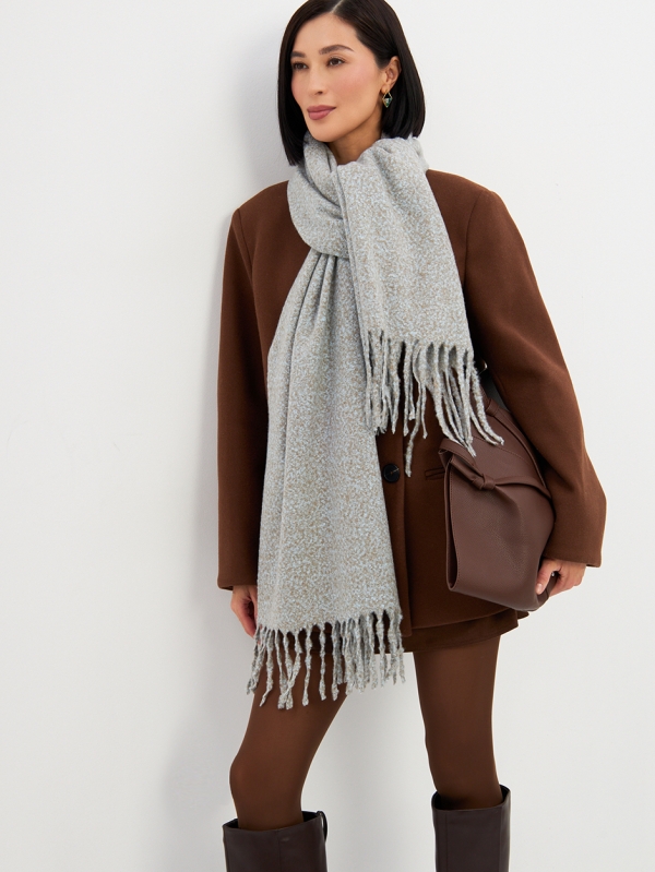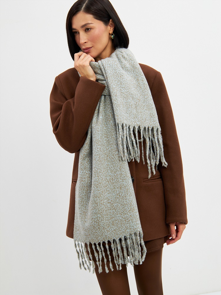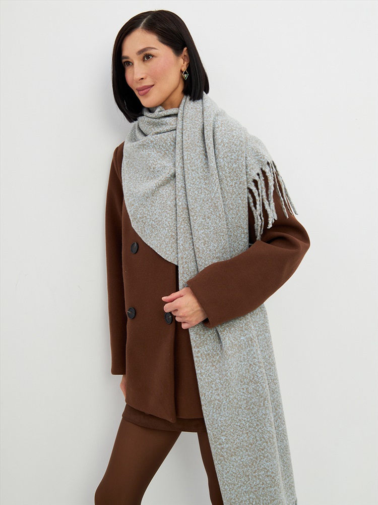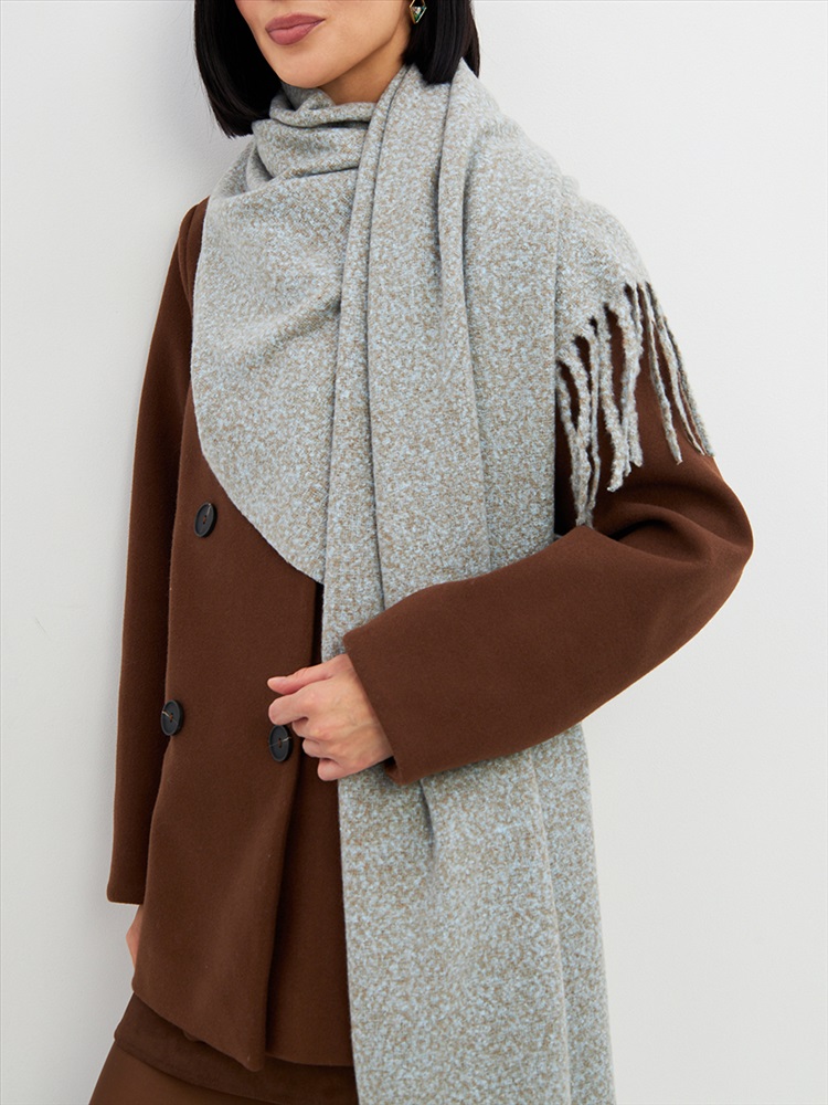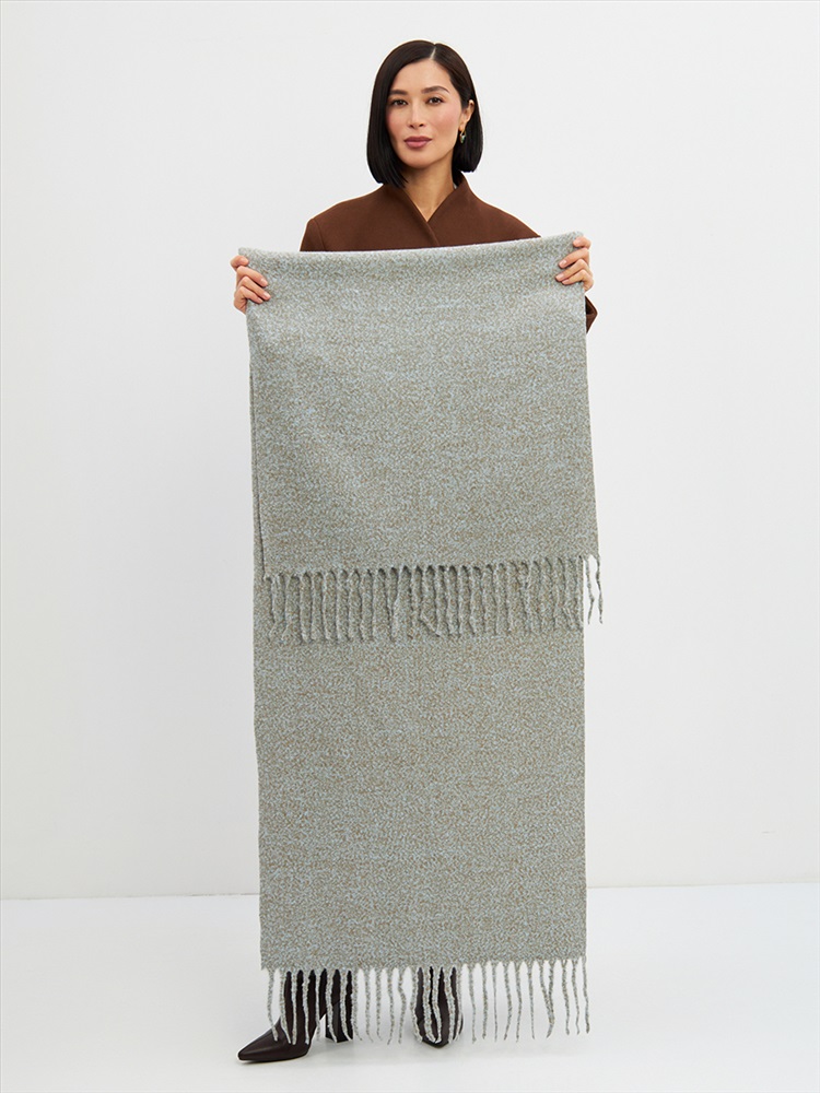 Большой, мягкий, теплый двусторонний однотонный меланжевый палантин. Края изделия украшены бахромой. Машинная деликатная стирка.