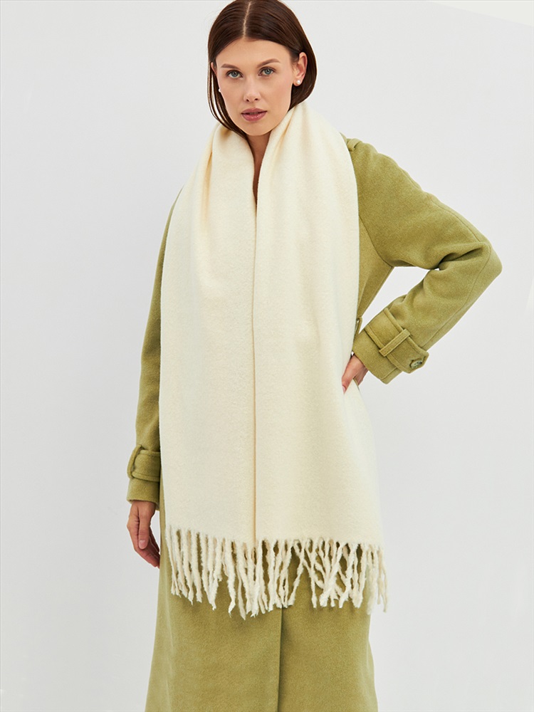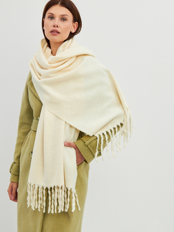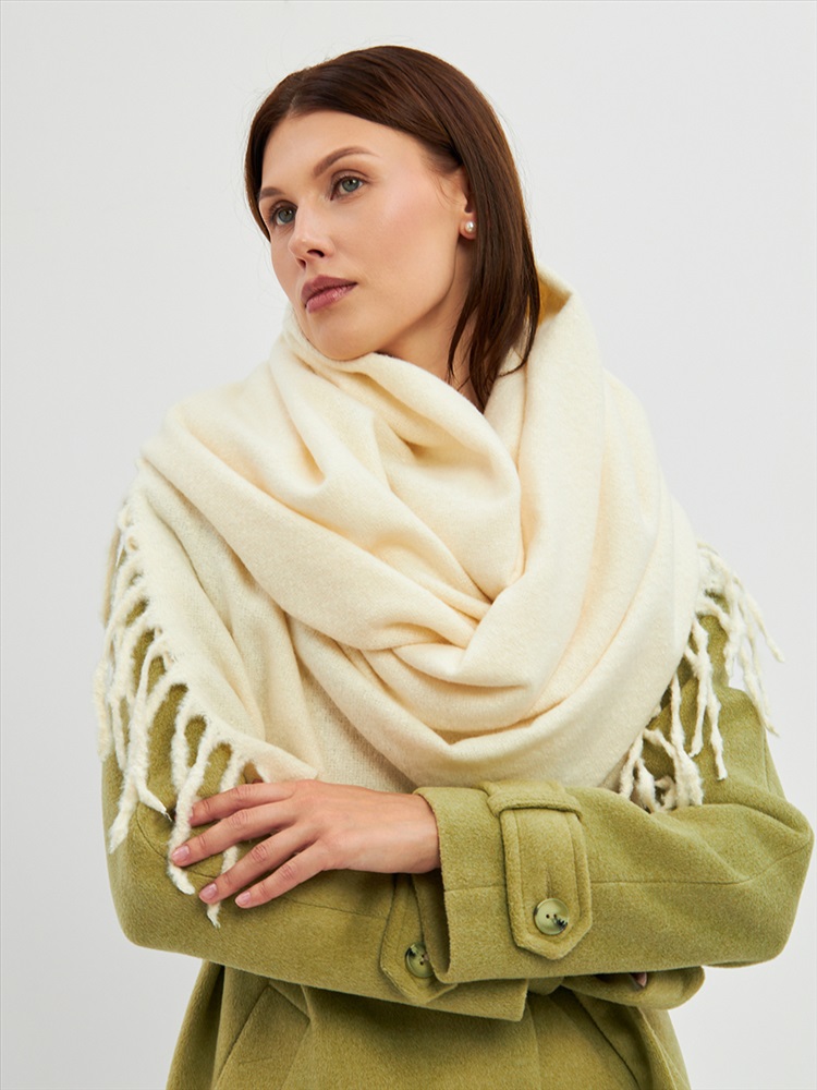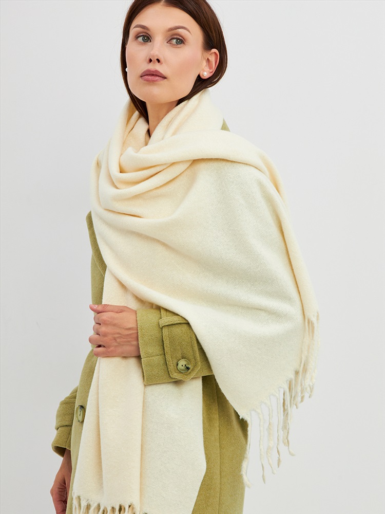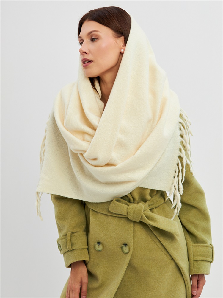 Большой, мягкий, теплый двусторонний однотонный палантин. Края изделия украшены бахромой. Машинная деликатная стирка.