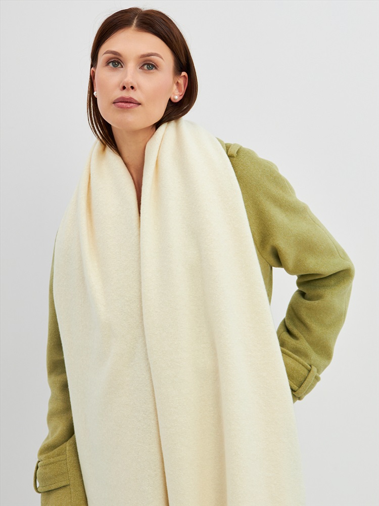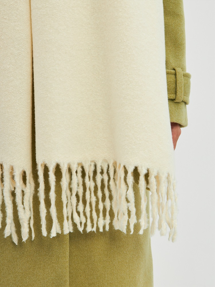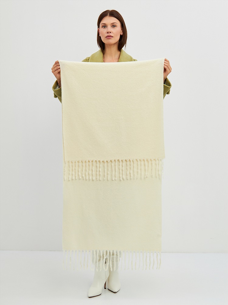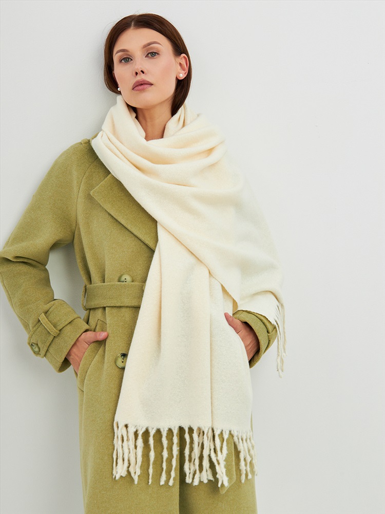 Большой, мягкий, теплый двусторонний однотонный палантин. Края изделия украшены бахромой. Машинная деликатная стирка.