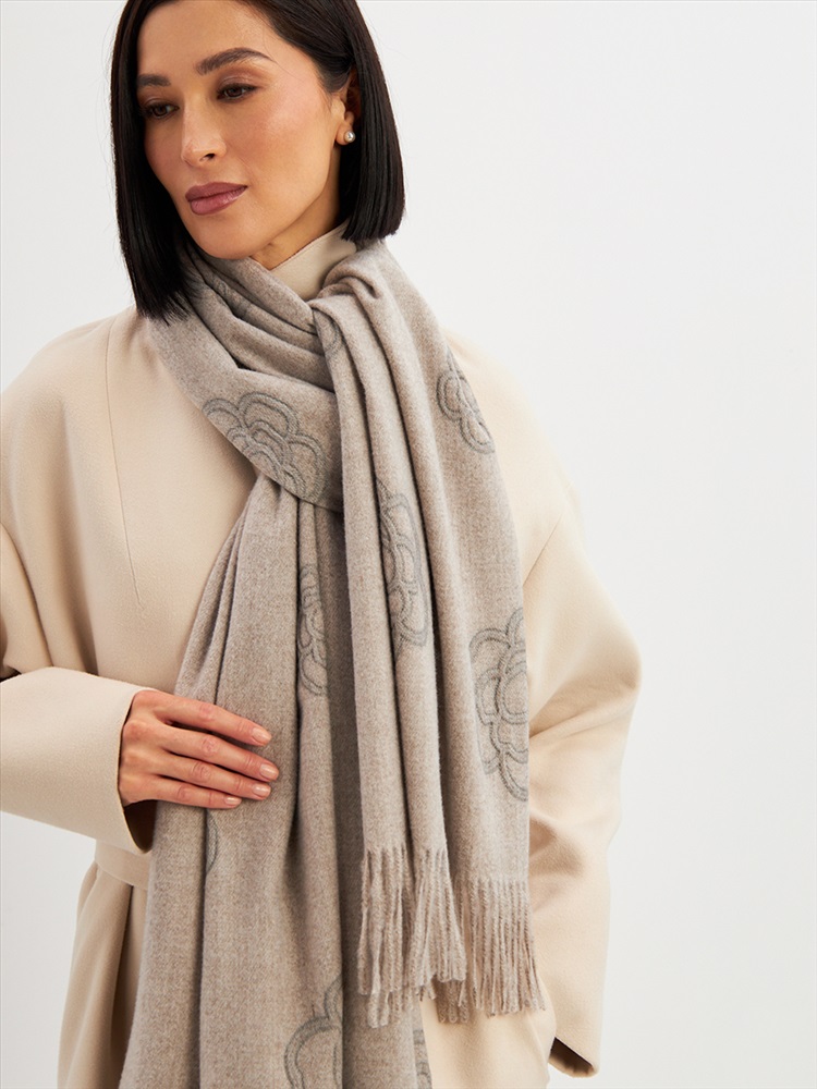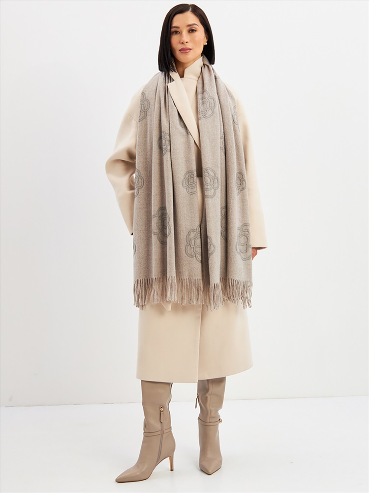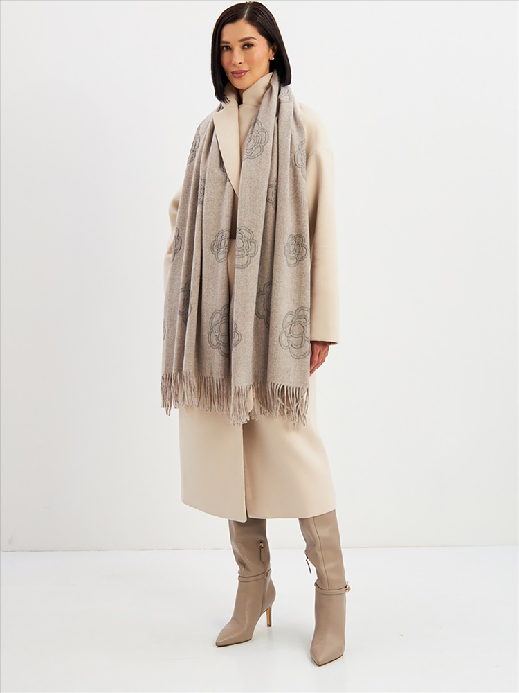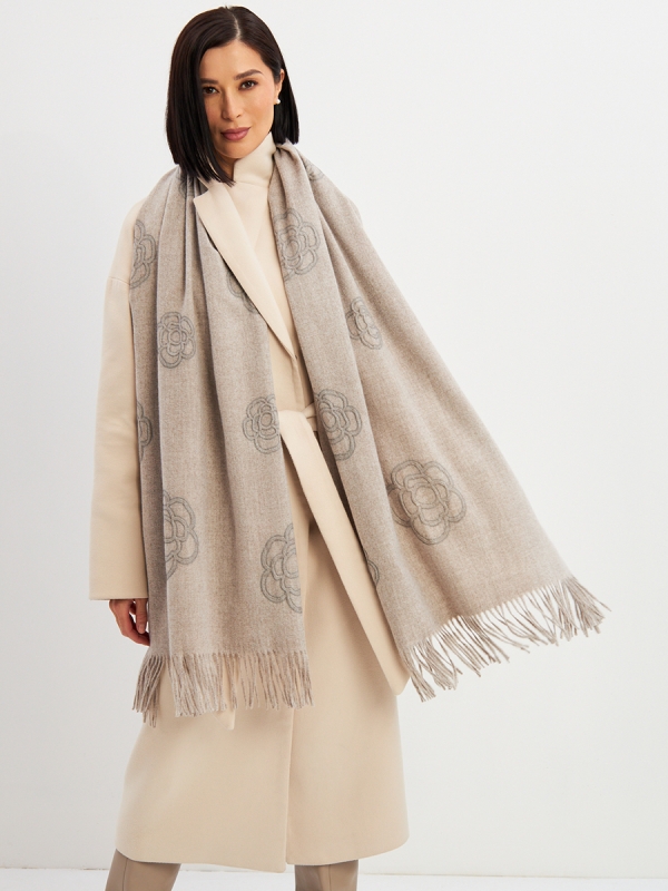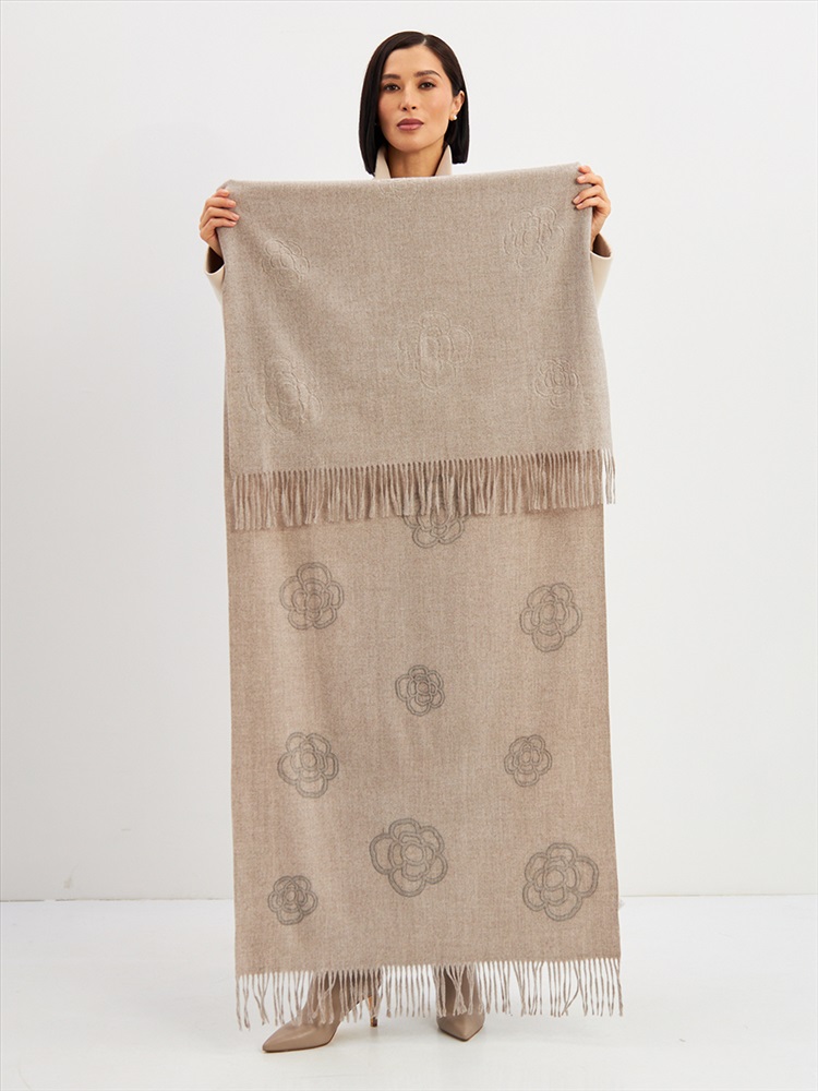 Большой, мягкий, теплый двусторонний однотонный палантин с принтом-печатью. Края изделия украшены бахромой. Машинная деликатная стирка.