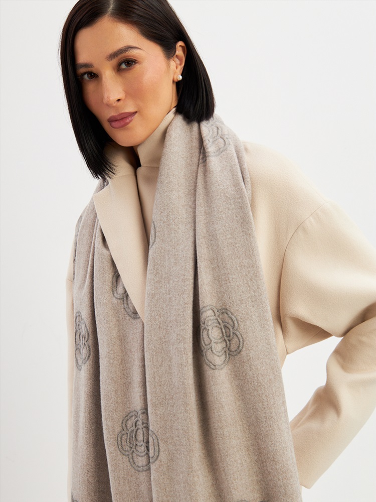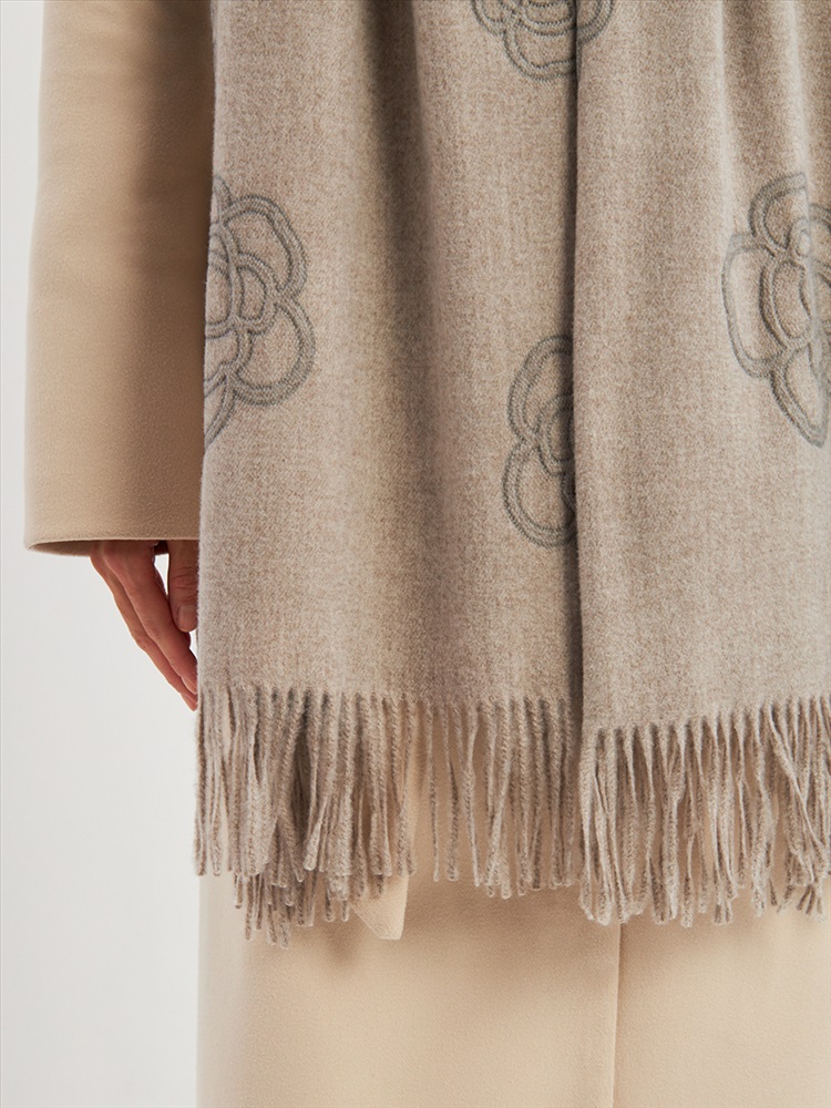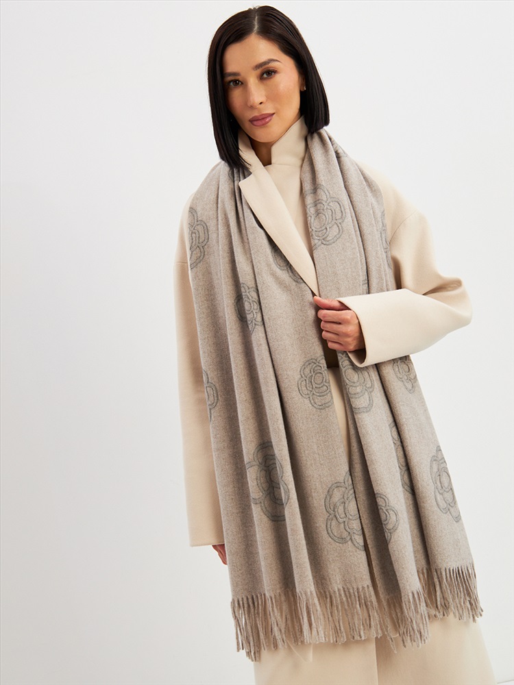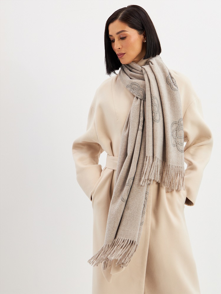 Большой, мягкий, теплый двусторонний однотонный палантин с принтом-печатью. Края изделия украшены бахромой. Машинная деликатная стирка.