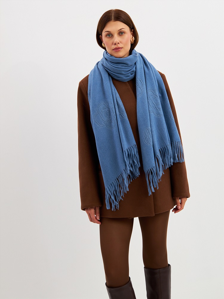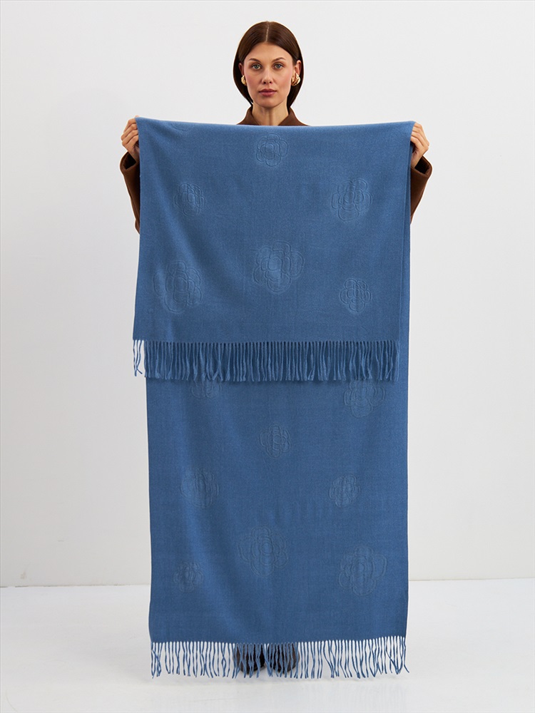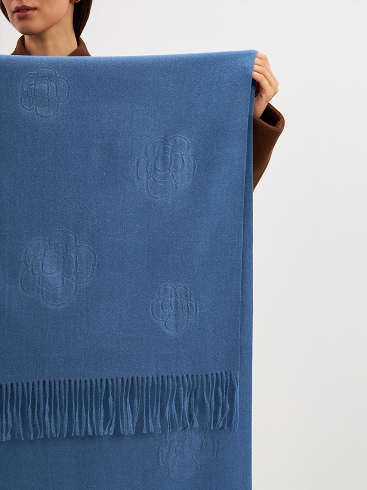 Большой, мягкий, теплый двусторонний однотонный палантин с принтом-печатью. Края изделия украшены бахромой. Машинная деликатная стирка.