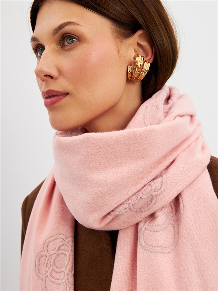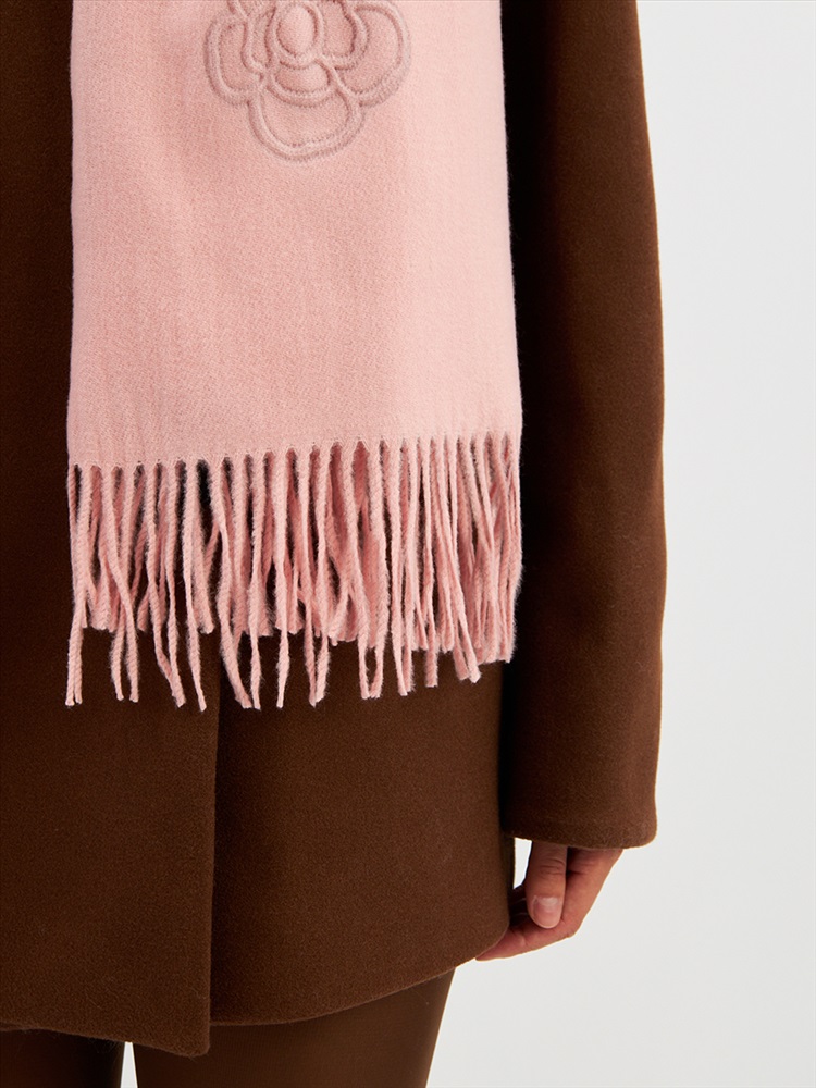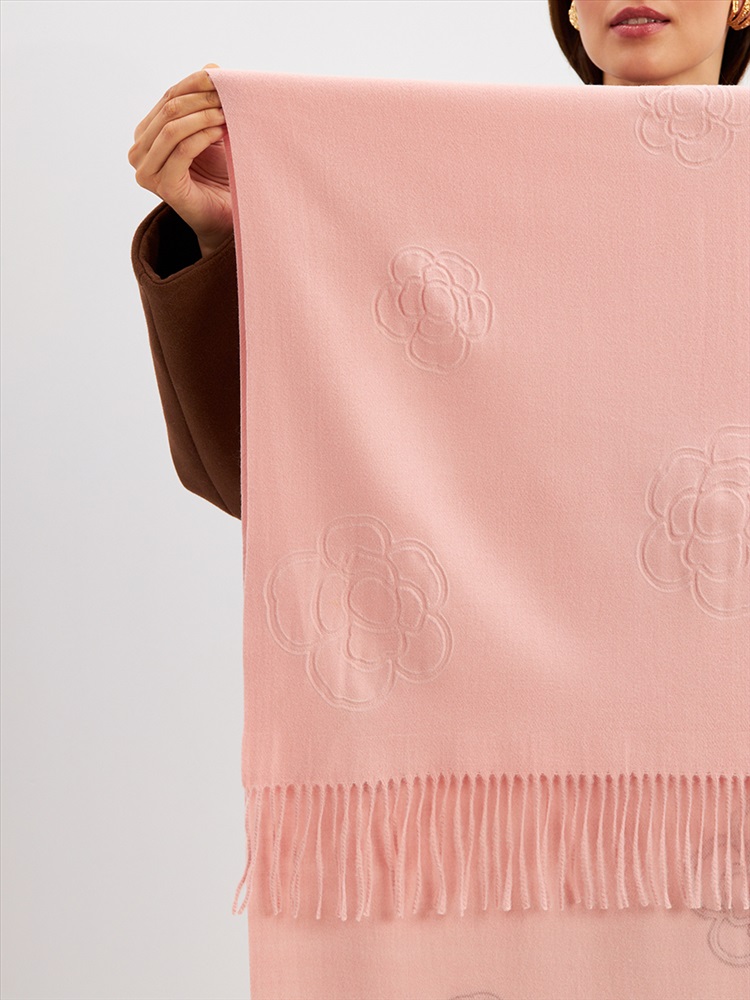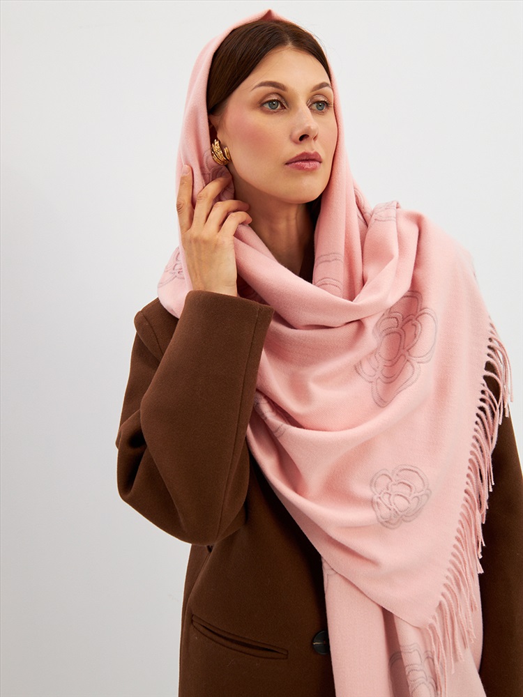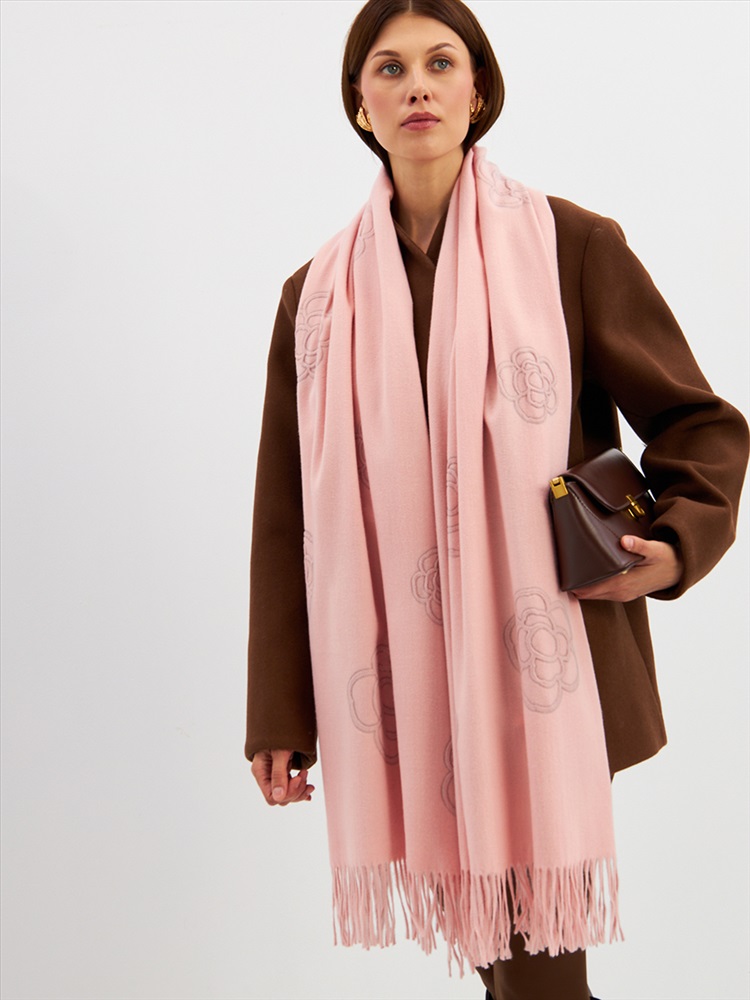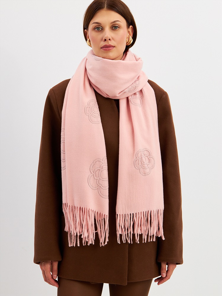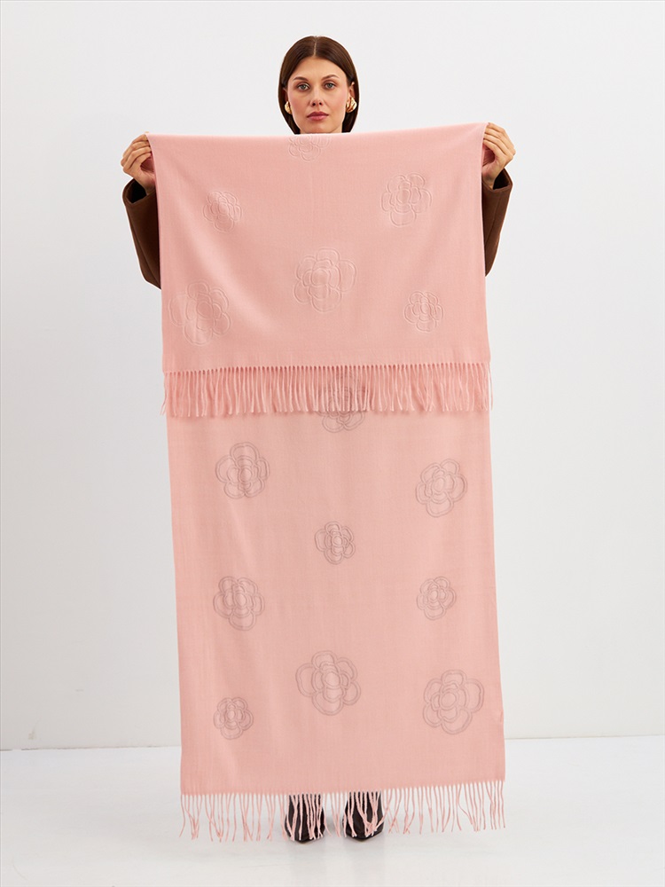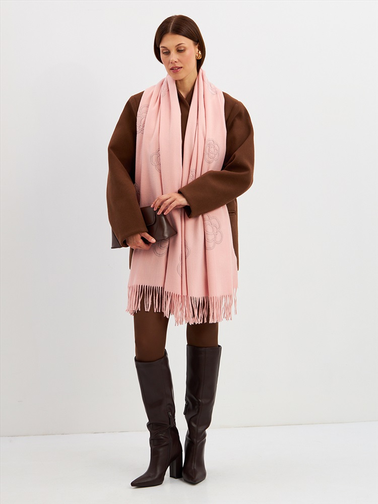 Большой, мягкий, теплый двусторонний однотонный палантин с принтом-печатью. Края изделия украшены бахромой. Машинная деликатная стирка.