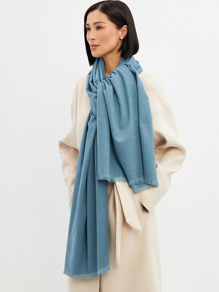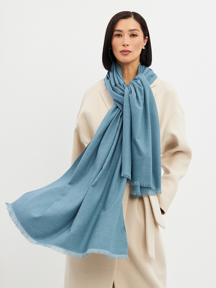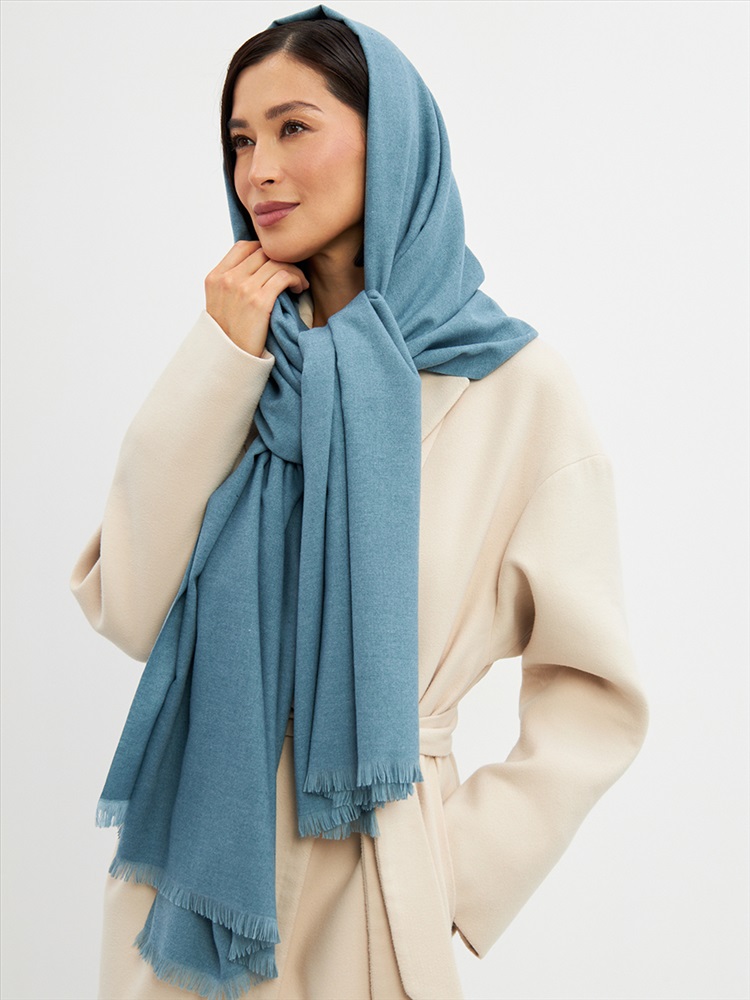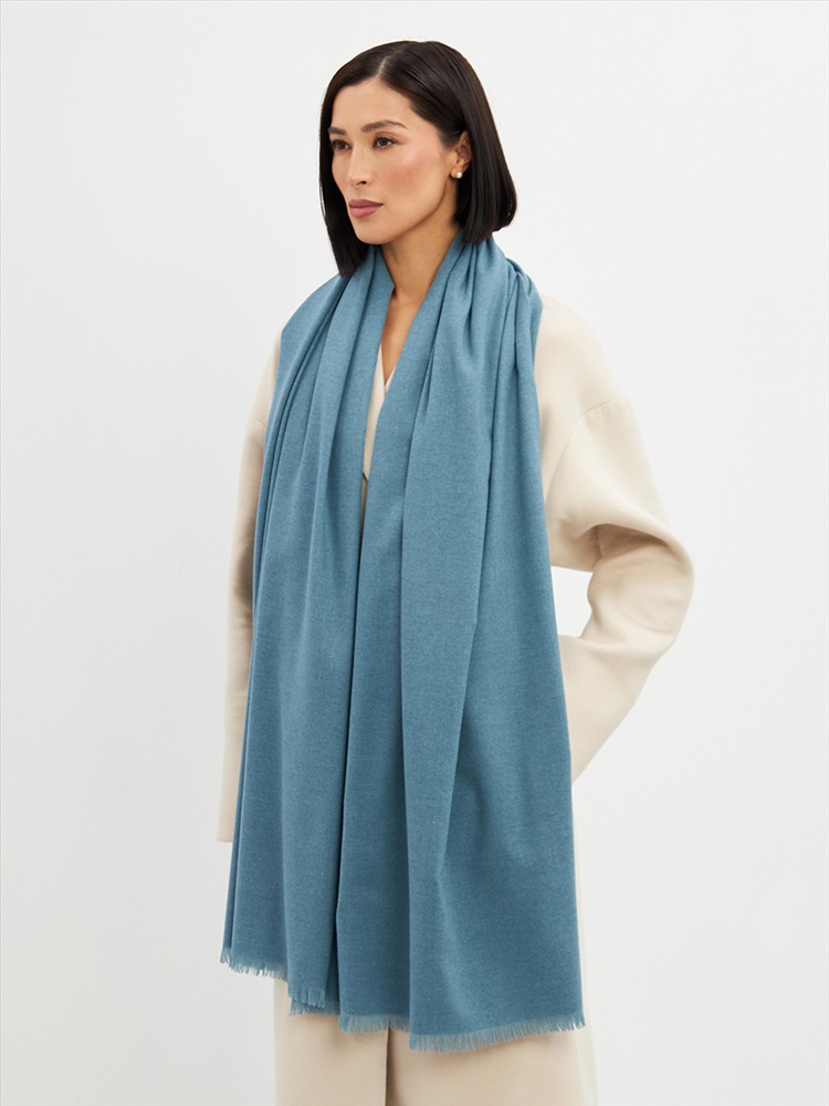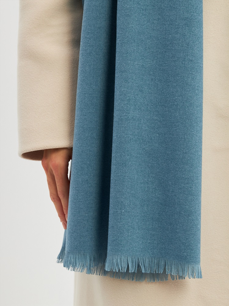 Большой, мягкий, теплый двусторонний однотонный палантин. Края изделия украшены бахромой. Машинная деликатная стирка.