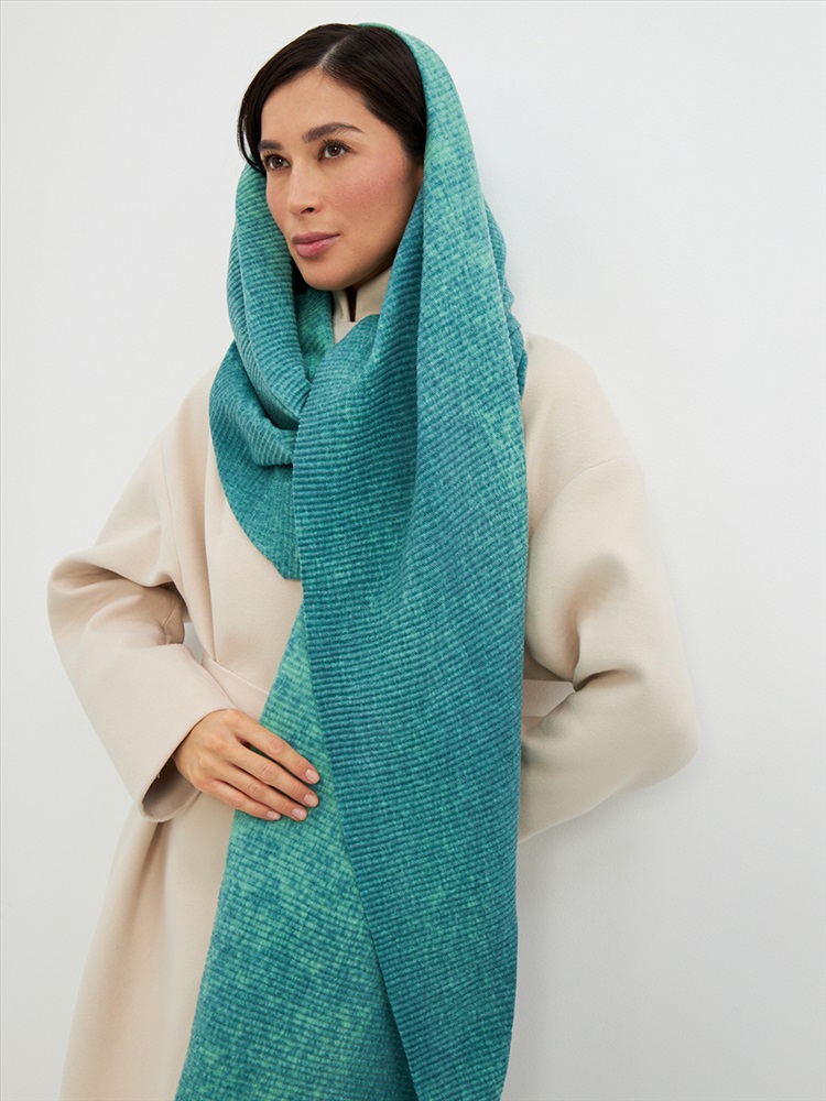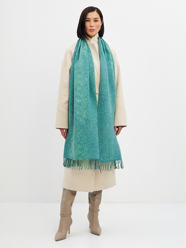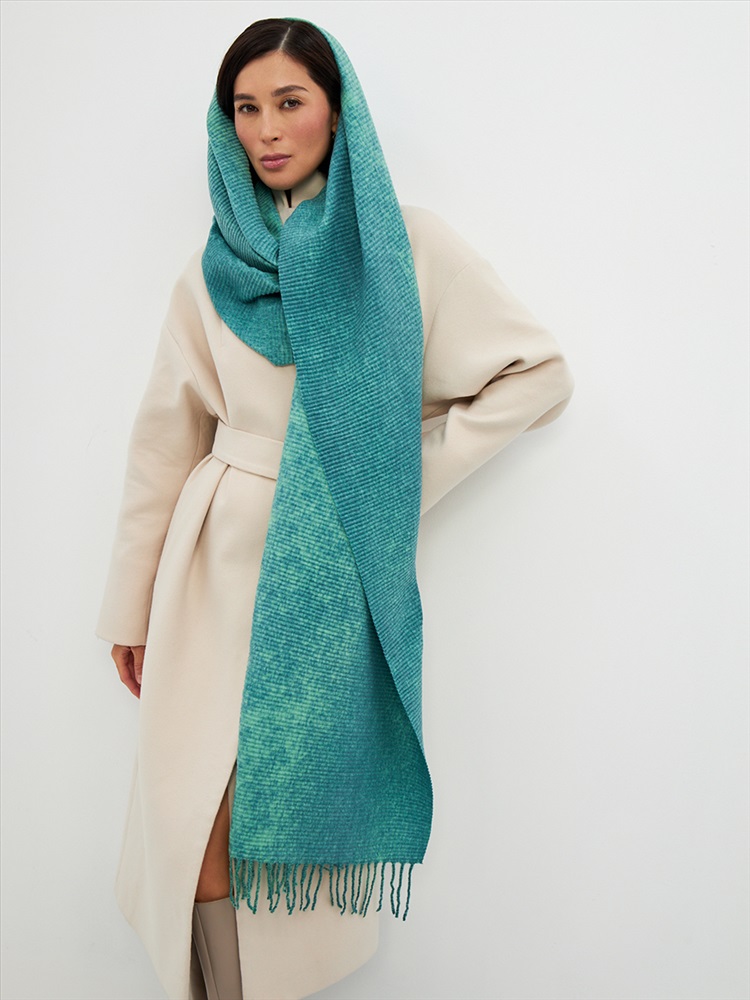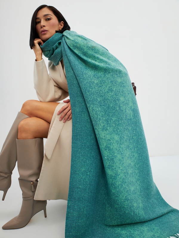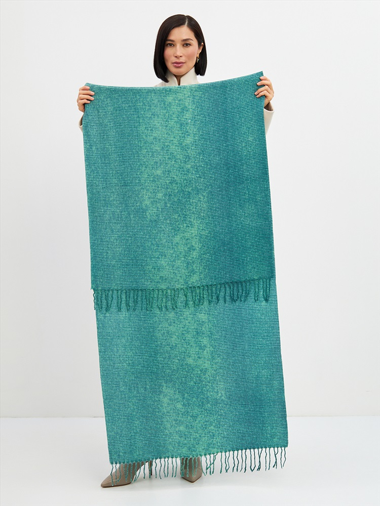 Большой, мягкий, теплый двусторонний однотонный палантин с градиентом переход тона. Края изделия украшены бахромой. Машинная деликатная стирка.