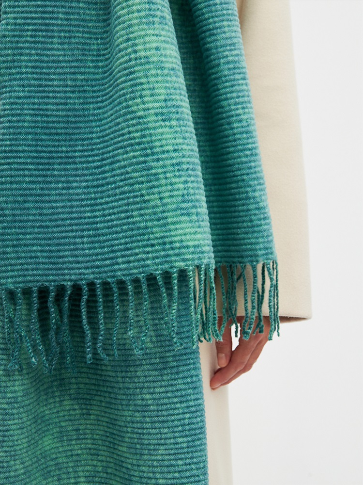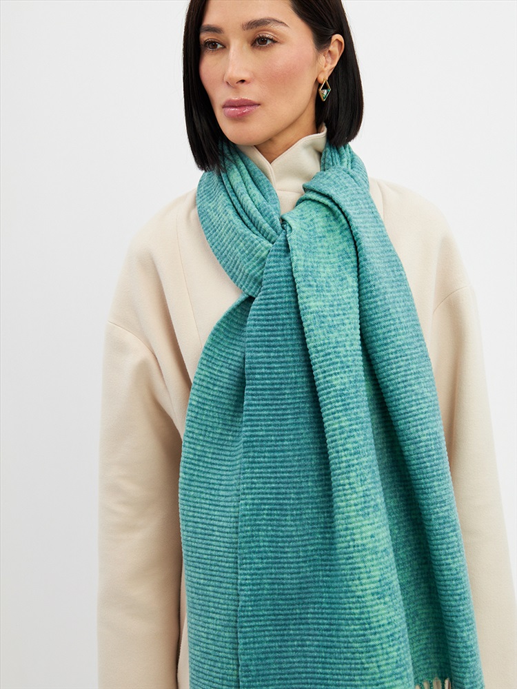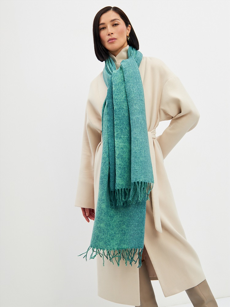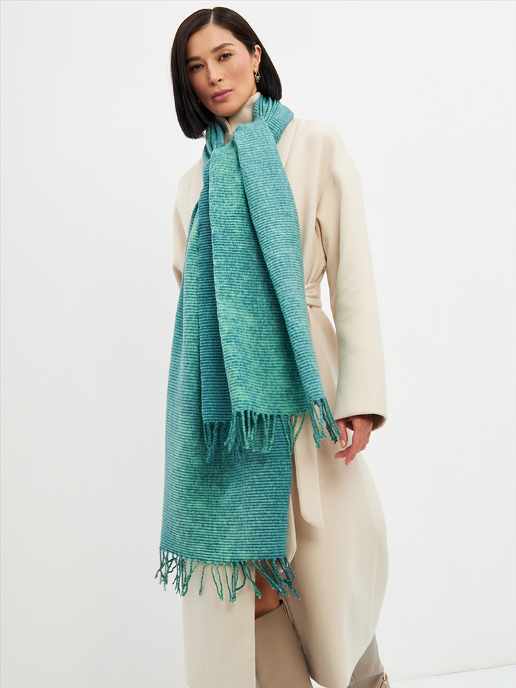 Большой, мягкий, теплый двусторонний однотонный палантин с градиентом переход тона. Края изделия украшены бахромой. Машинная деликатная стирка.