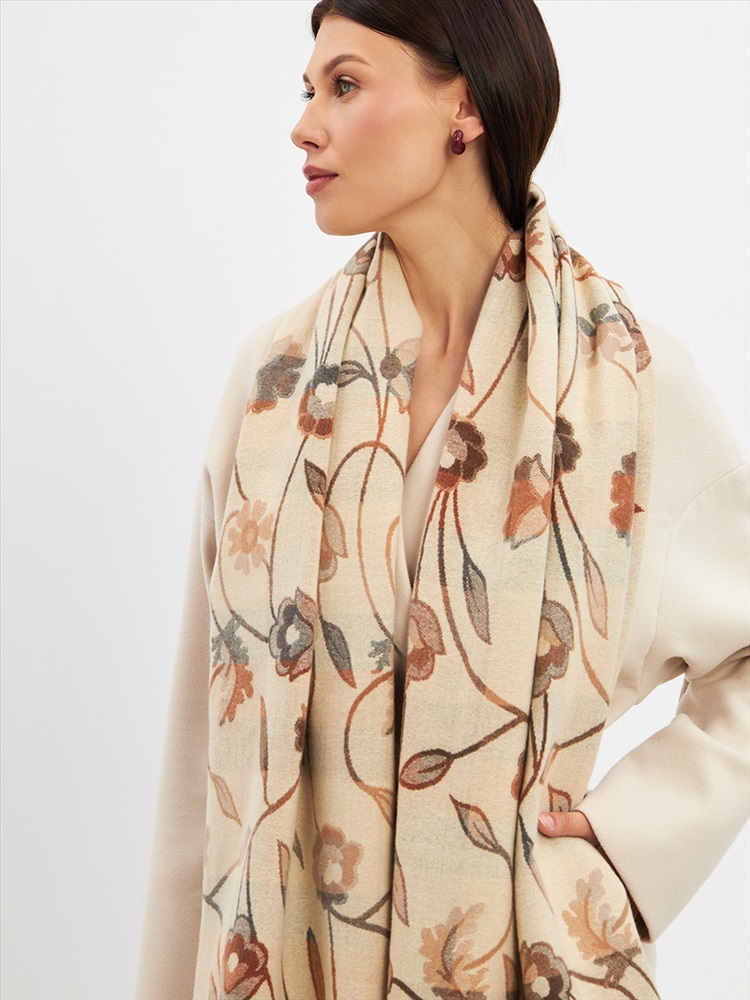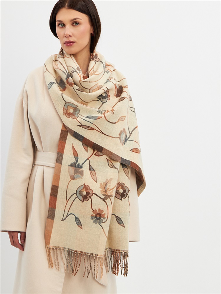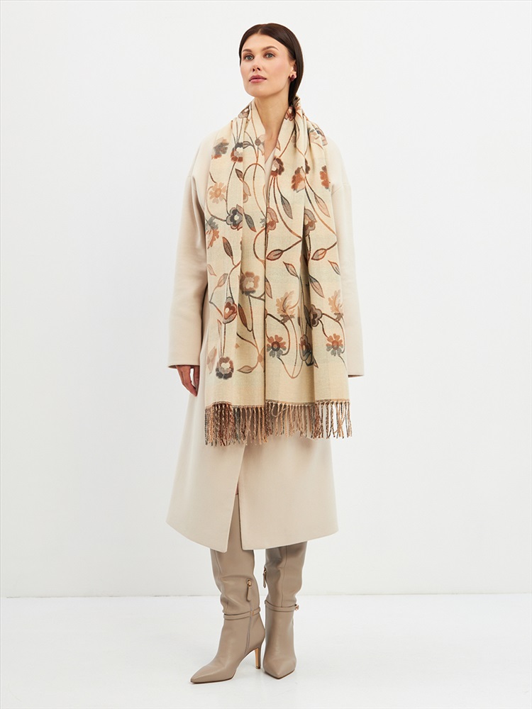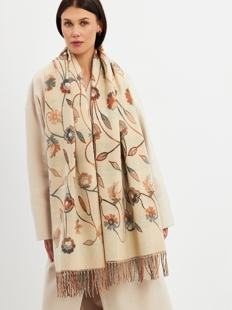 Цвет: Бежевый Состав: 55% вискоза, 25% кашемир, 20% шерсть Состав: Вискоза, Шерсть, Кашемир Размер: 70 x 180 см Принт: Цветочный, Орнаментальный Большой, мягкий, плотный и очень нежный палантин с рисунком. Края изделия украшены бахромой ручной работы. Машинная деликатная стирка. Комментарии к товару