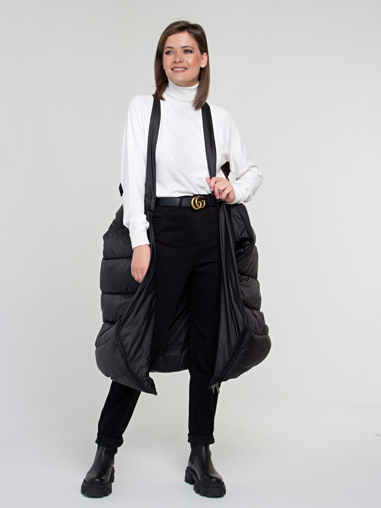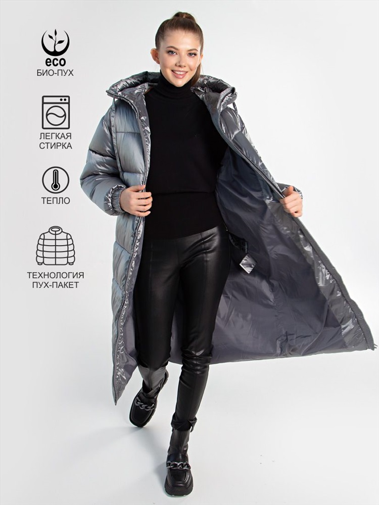 Длина: 110 см Пальто сшитое из непромокаемого гладкого полиэстера, эффект блеска в сером цвете получен путем сплетения нескольких нитей, в черном цвете ткань изделия матовая. Пальто имеет плавный силуэт, цельнокроеный капюшон, карманы утеплены флисом, манжеты рукавов на резинке.В комплекте-удобный пояс- бретели, благодаря которым куртку можно носить на плече как сумку или рюкзак,либо использовать в качестве пояса.