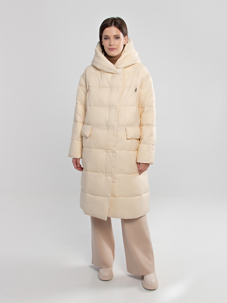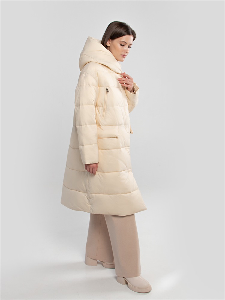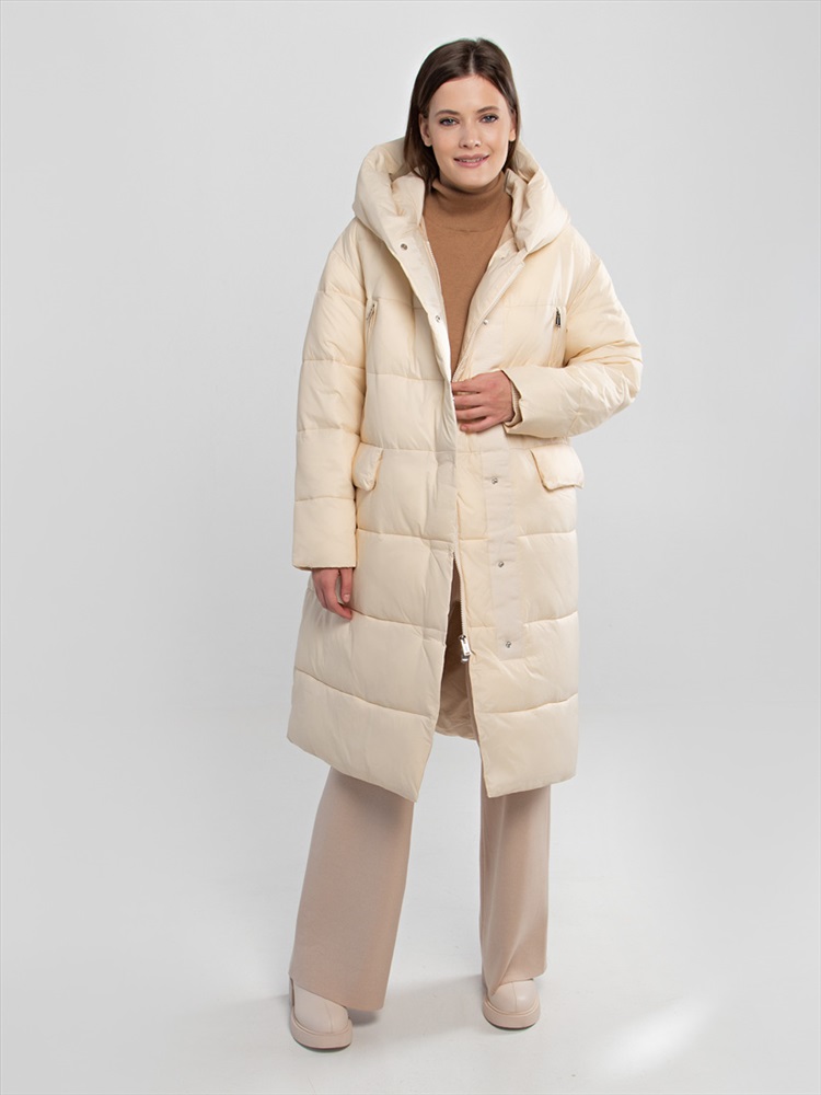 Длина: 108см Пуховик средней длины из осенне-зимней коллекции станет идеальным вариантом верхней одежды для холодной ветреной погоды. Стеганое пальто сшили из тонкого плотного непродуваемого нейлона с гладкой  поверхностью. Изделие утеплили легким  био-пухом из переработанного пластика. За дополнительный комфорт отвечают объемный цельнокроеный капюшон, широкая планка и теплые карманы. Пуховик декорирован фактурными лентами в тон ткани верха, которые дополнительно усиливают кнопки.