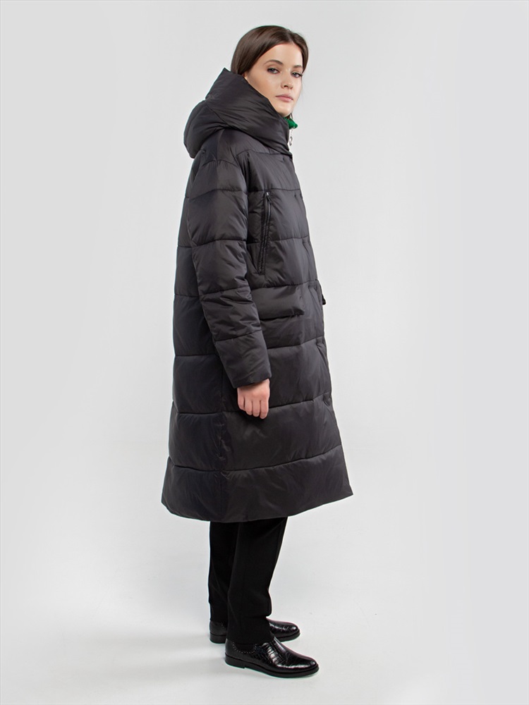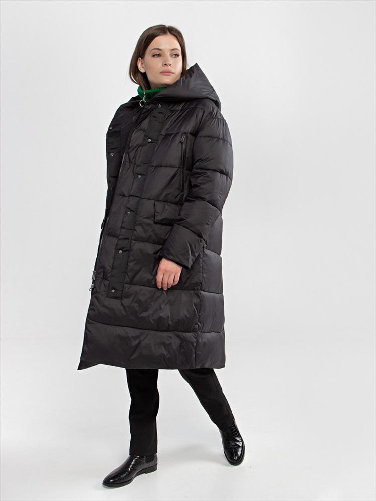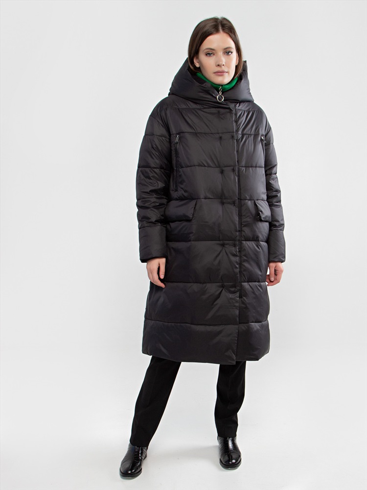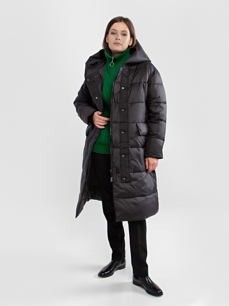 Длина: 108см Пуховик средней длины из осенне-зимней коллекции станет идеальным вариантом верхней одежды для холодной ветреной погоды. Стеганое пальто сшили из тонкого плотного непродуваемого нейлона с гладкой поверхностью. Изделие утеплили легким био-пухом из переработанного пластика. За дополнительный комфорт отвечают объемный цельнокроеный капюшон, широкая планка и теплые карманы. Пуховик декорирован фактурными лентами в тон ткани верха, которые дополнительно усиливают кнопки.