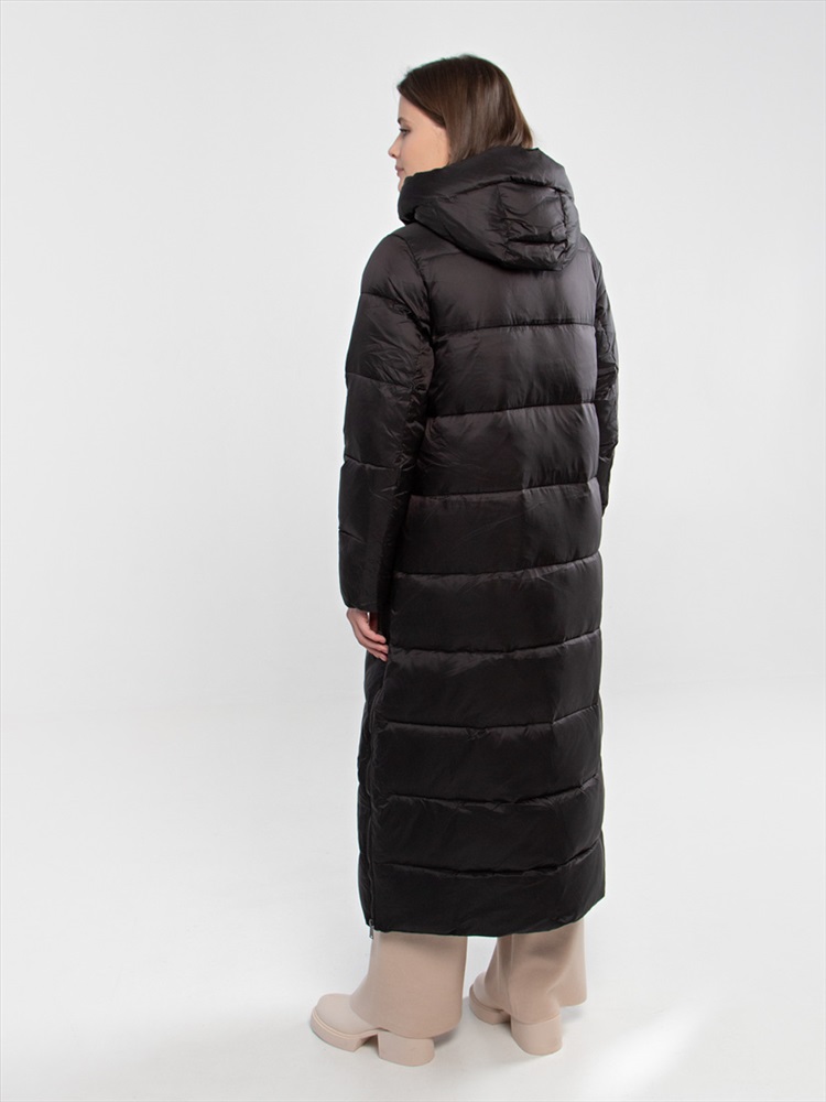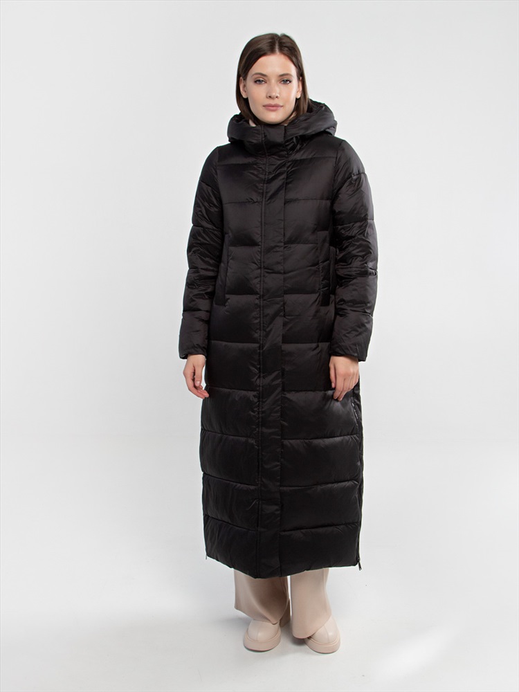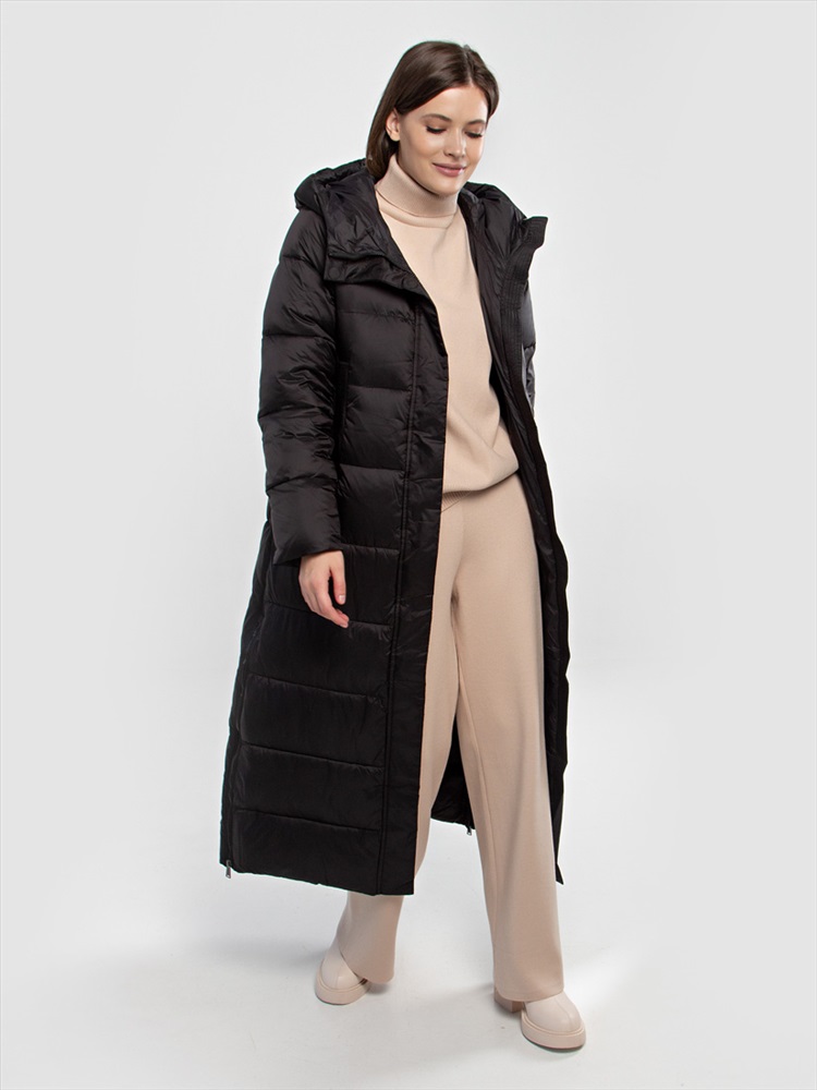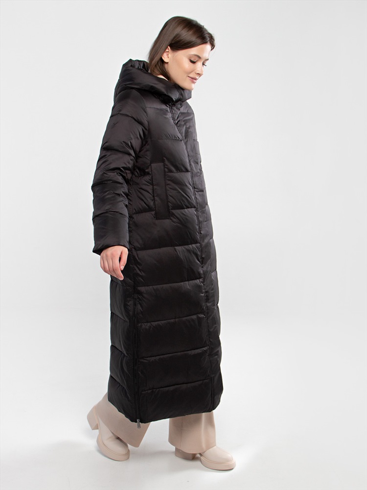 Длина: 125см Длинный пуховик из осенне-зимней коллекции станет идеальным вариантом верхней одежды для холодной ветреной погоды. Стеганое пальто изотовлено из непродуваемого нейлона с гладкой сатиновой поверхностью. Изделие утеплено легким био-пухом. За дополнительный комфорт отвечают воротник-стойка, объемный капюшон, внутренние манжеты рукавов. Для удобства черные боковые замки, которые идеально сочетаются с черной подкладкой. Карманы на магнитных кнопках.