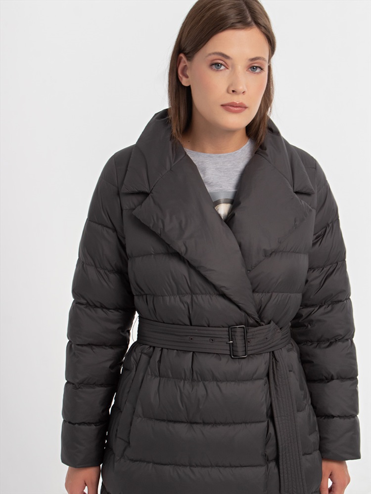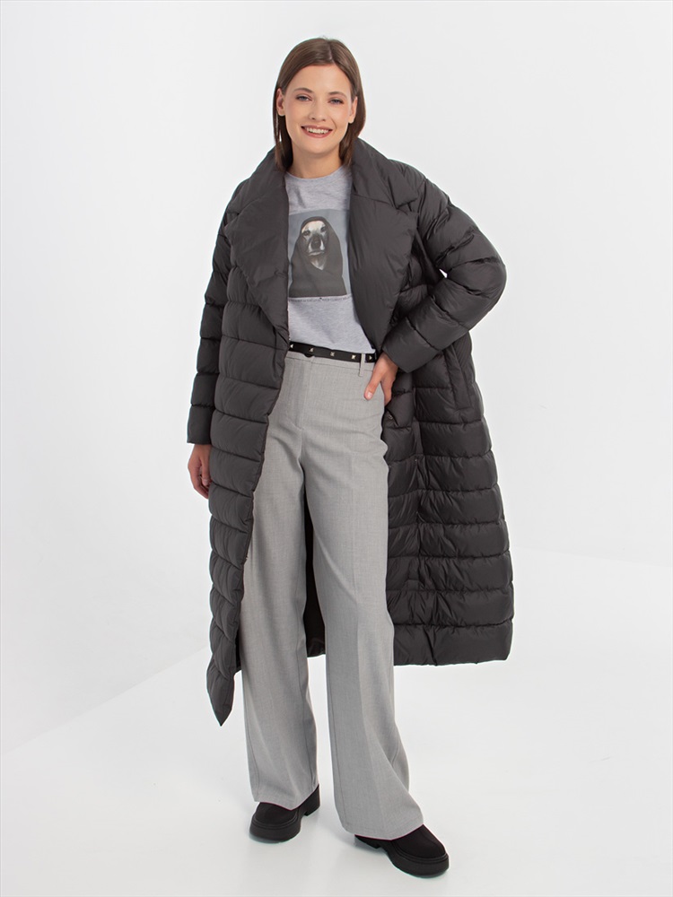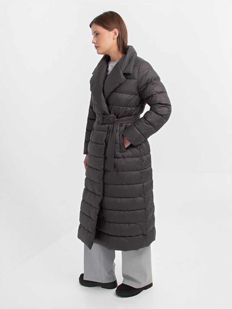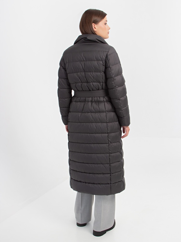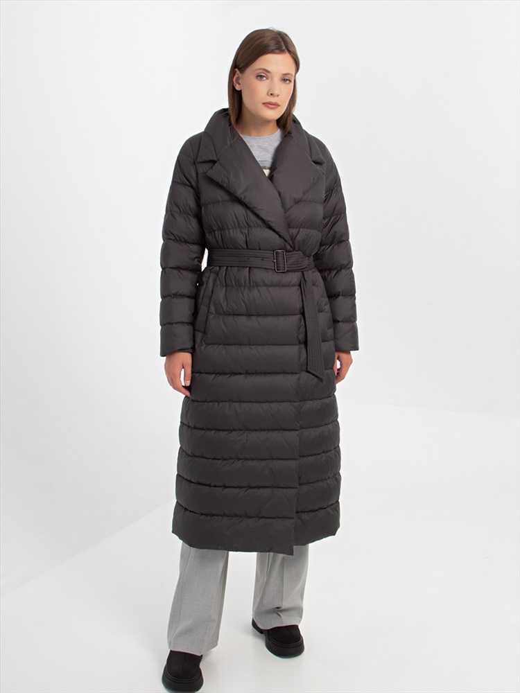 Длина: 121см Стеганое пальто одинаково гармонично поддержит  как образы стиля casual, так и более строгие ансамбли. Все дело в классических базовых цветах, прямом крое, воротнике. Элегантного акцента добавит пояс с пряжкой на шлевках, приталивающей силуэт.  Утеплитель био-пух для этого изделия получили из 15 переработанных пластиковых бутылок.