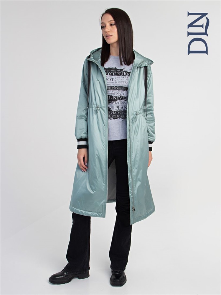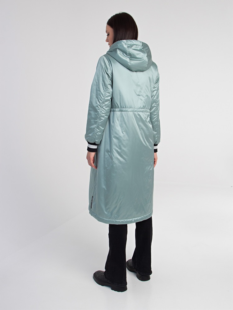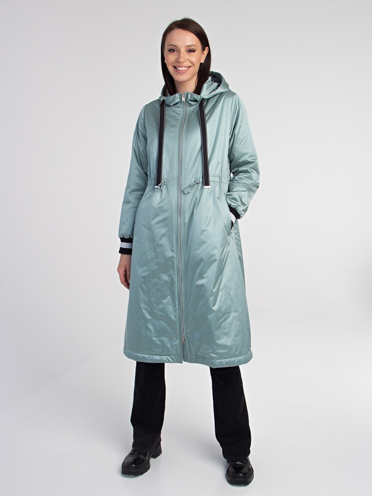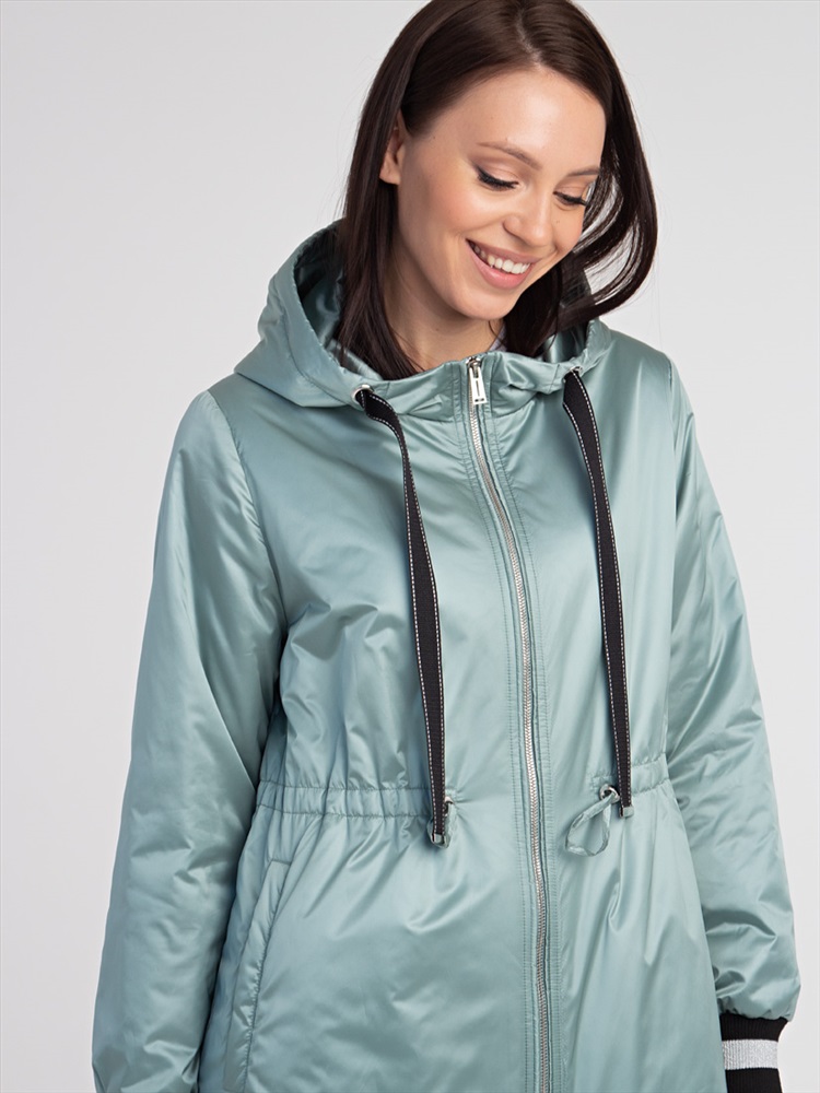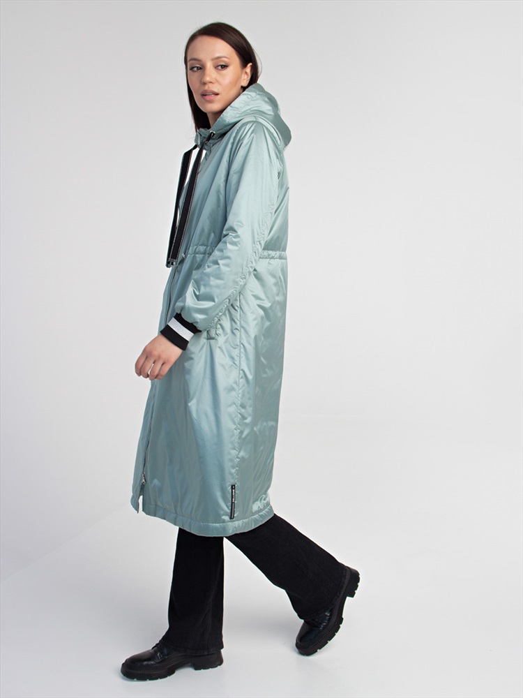 Длина: 112 см Универсальное пальто на тонком утеплителе с трикатажными манжетами, карманы прорезные. Цельнокройный капюшон с лентами, кулиска по линии талии. Центральная застежка на металлическую молнию. Рост модели 172 см, на ней пальто размера 42.