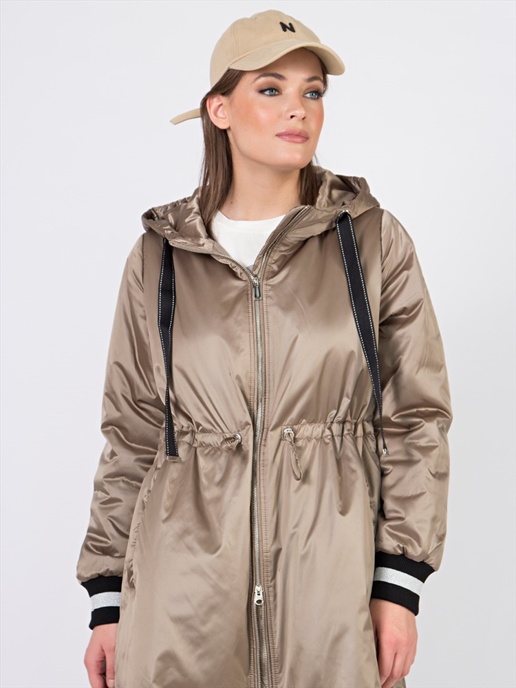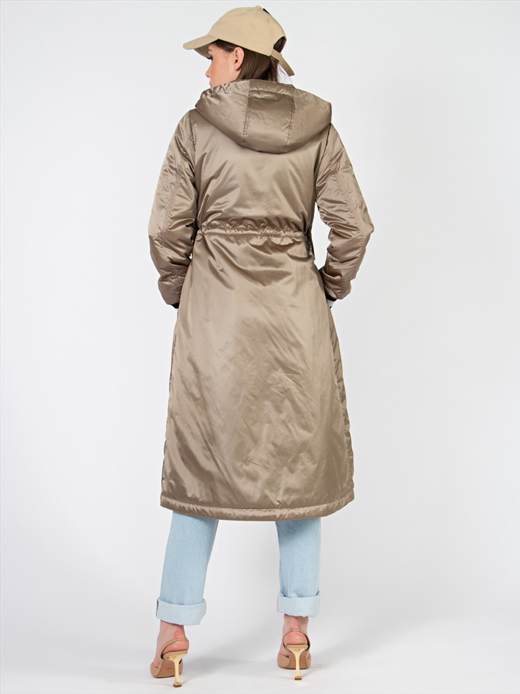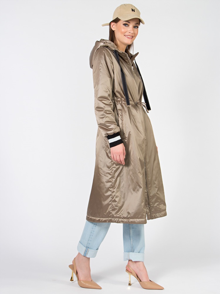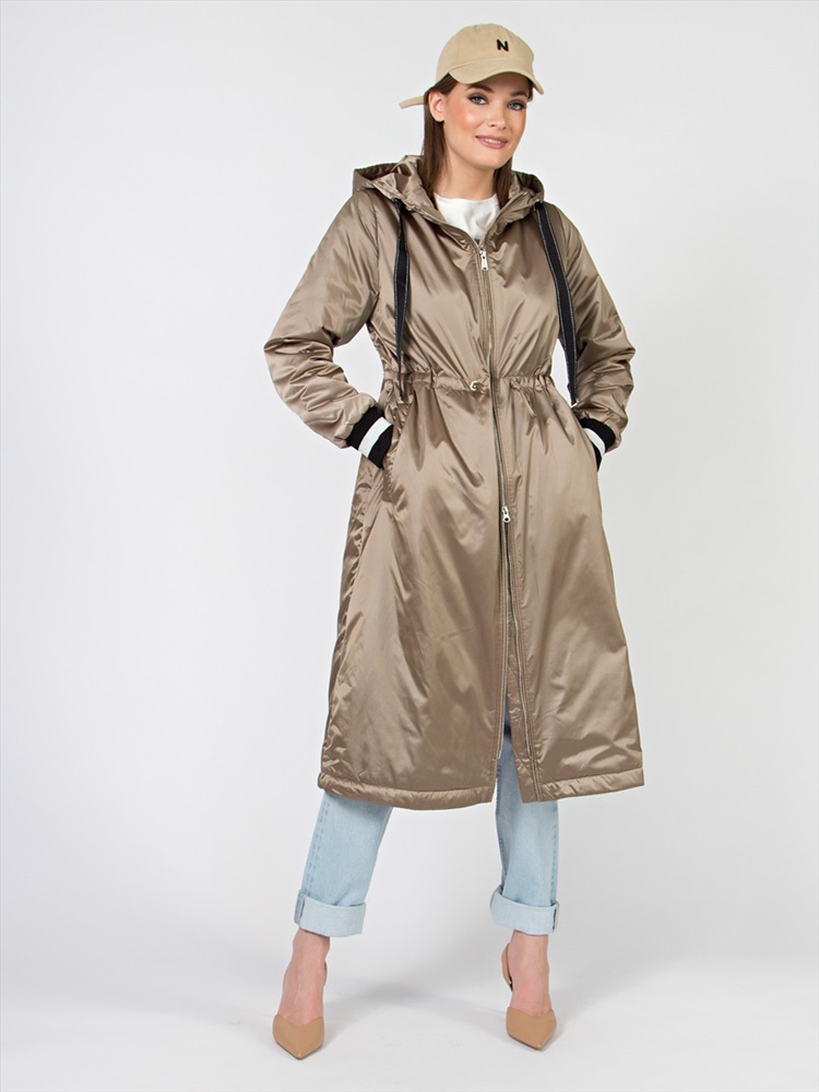 Длина: 112 см Универсальное пальто на тонком утеплителе с трикатажными манжетами, карманы прорезные. Цельнокройный капюшон с лентами,  кулиска по линии талии. Центральная застежка на металлическую молнию. Рост модели 172 см, на ней пальто размера 42.