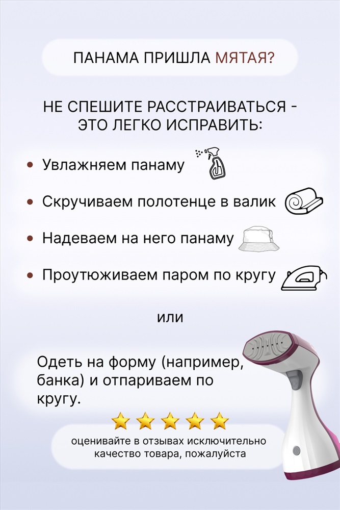 Состав: 50% хлопок, 50% полиэстер Модель: Панама женская GL408 Тип товара: панама Материал: полиэстер | полиэстер Бренд: Глобал Текс Назначение: для дачи Рейтинг: Рейтинг 4 и выше Рисунок: цветы Сезонность: лето | осень | весна Панама - идеальный головной убор для теплого времени года. Подчеркните свой стиль данным аксессуаром! Данная шляпа подойдет для пляжа, активного отдыха и занятий спортом. Панама унисекс, она отлично впишется в гардероб и мужчины, и женщины. Текстильная шапка сочетается со спортивным, повседневным и классическим стилем. Женская и мужская панама выполнена из 100% хлопка, она прекрасно сохраняет форму, но при этом дышит и отводит влагу. Трендовая панамка подойдет и на осень. Данную вещь можно миксовать с совершенно разной одеждой: худи, лонгсливы, джоггеры и джинсы. Порадуйте себя, заказав панаму отличного качества. После упаковки и транспортировки панама может быть немного мятой - это легко устраняется паром или стиркой, после стирки нужно подобрать круглую форму (банка, мяч), на которую надевают изделие до полного высыхания. Таблица размеров и веса
