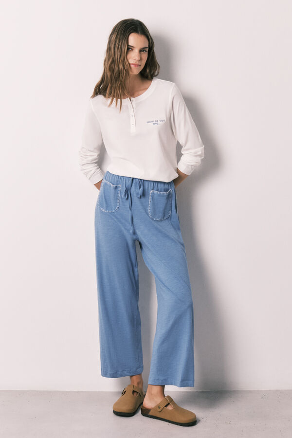 Pantalón largo Capri de tejido 100% algodón, con cintura elástica y cordón ajustable para un ajuste personalizado. De corte recto, incorpora bolsillos delanteros de parche y detalle de pespunte decorativo en bolsillos y costura lateral. Ideal para combinar con camisetas de la colección y disfrutar de máxima comodidad en casa. Esta prenda pertenece a una colaboración especial de Chloé Sucré x Women´Secret.