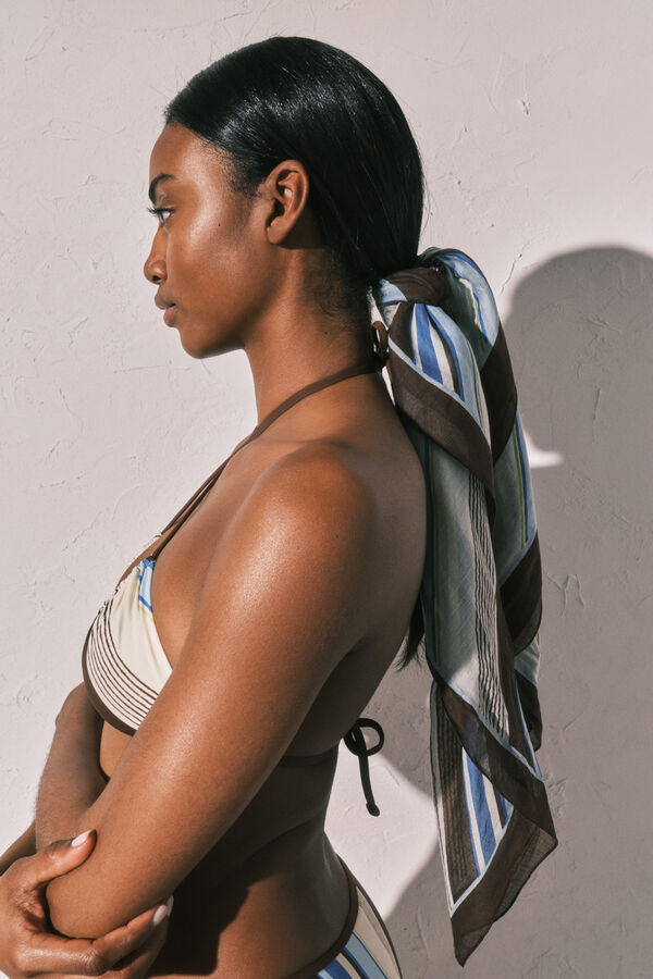 Pañuelo con estampado de rayas multicolor confeccionado en tejido 100% algodón. Llévalo como foulard, anudado a la cintura, tipo top… Personaliza tu look con un toque de color, súper tendencia.