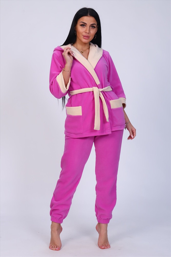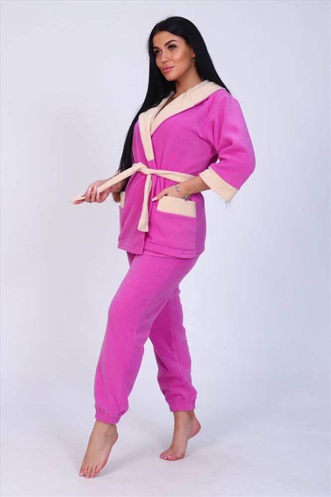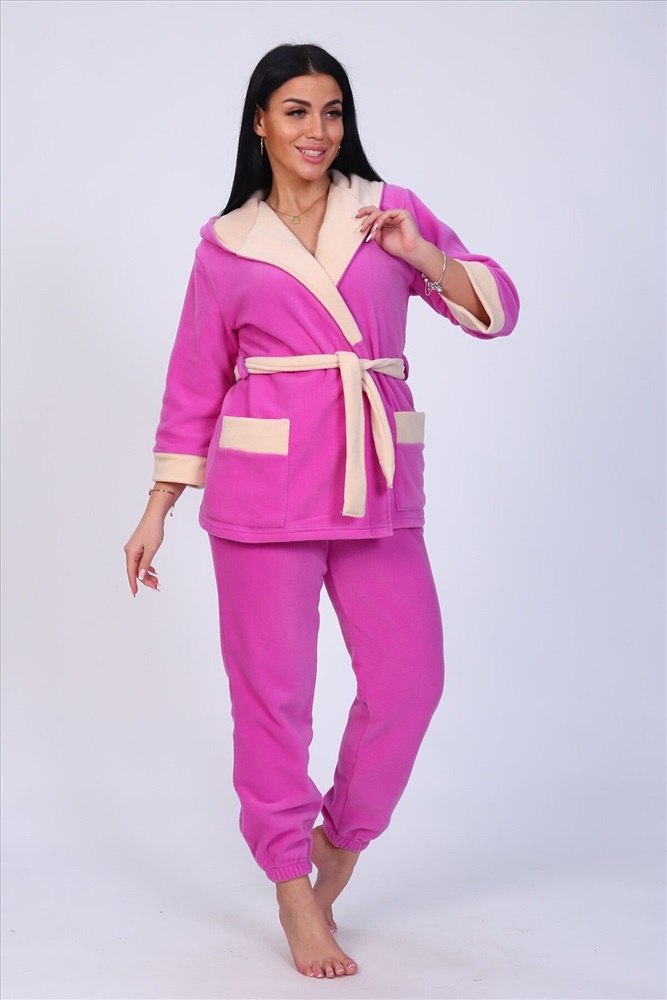 Пеньюар с брюками из флиса. Халат укороченный6 рукав 3/4, с накладными карманами, на поясе. Двойной капюшон. Карманы, манжеты, капюшон и пояс выполнены из ткани компаньон. Брюки низ на резинке, пояс прострочен, боковые карманы. Комфортный, теплый, универсальный комплект подходит для дома, для беременных и кормящих.