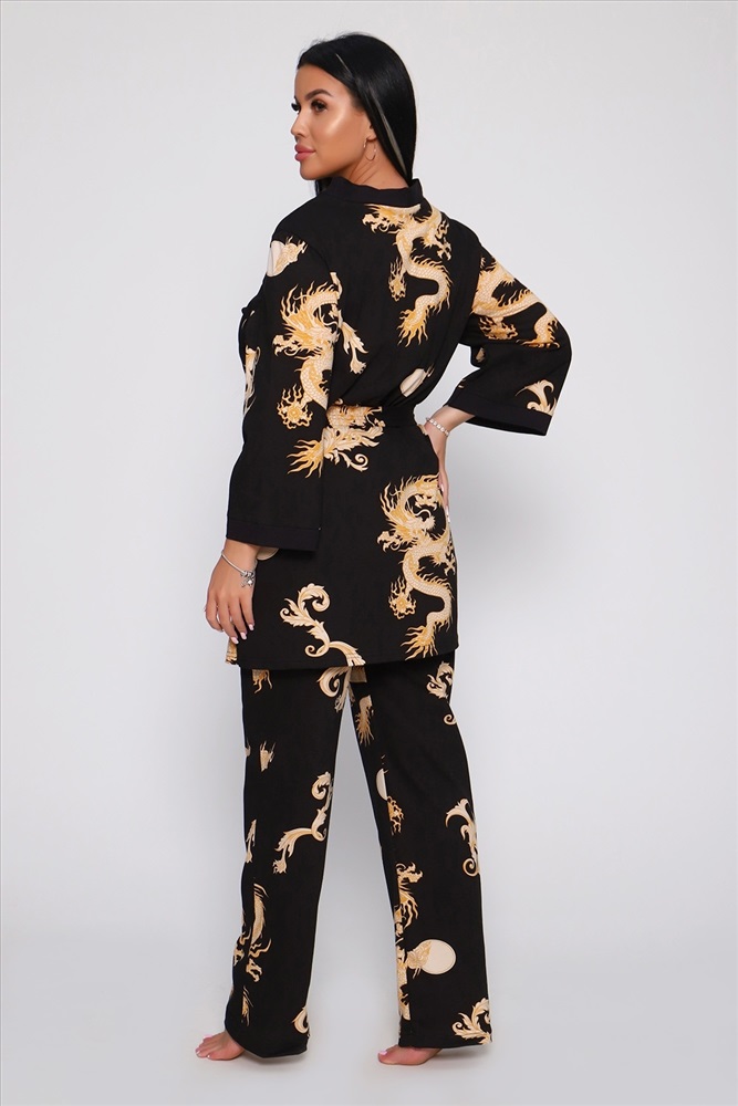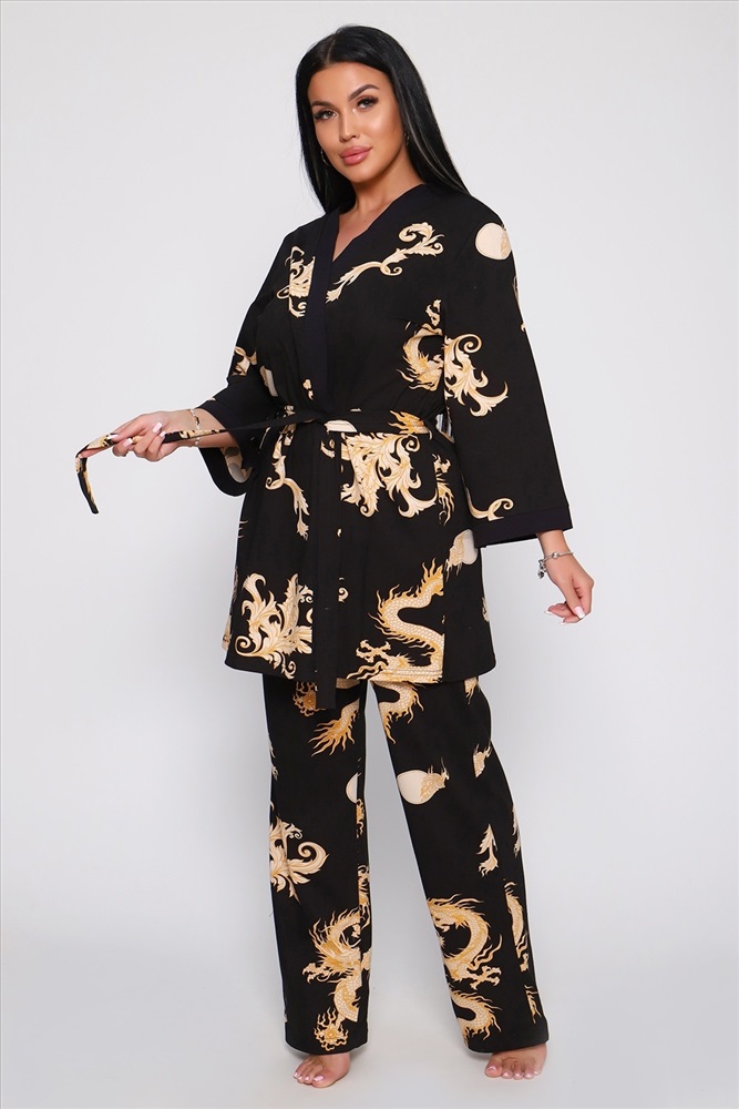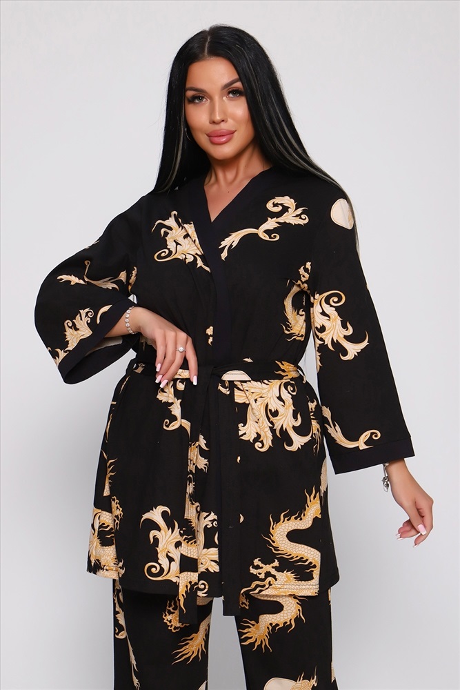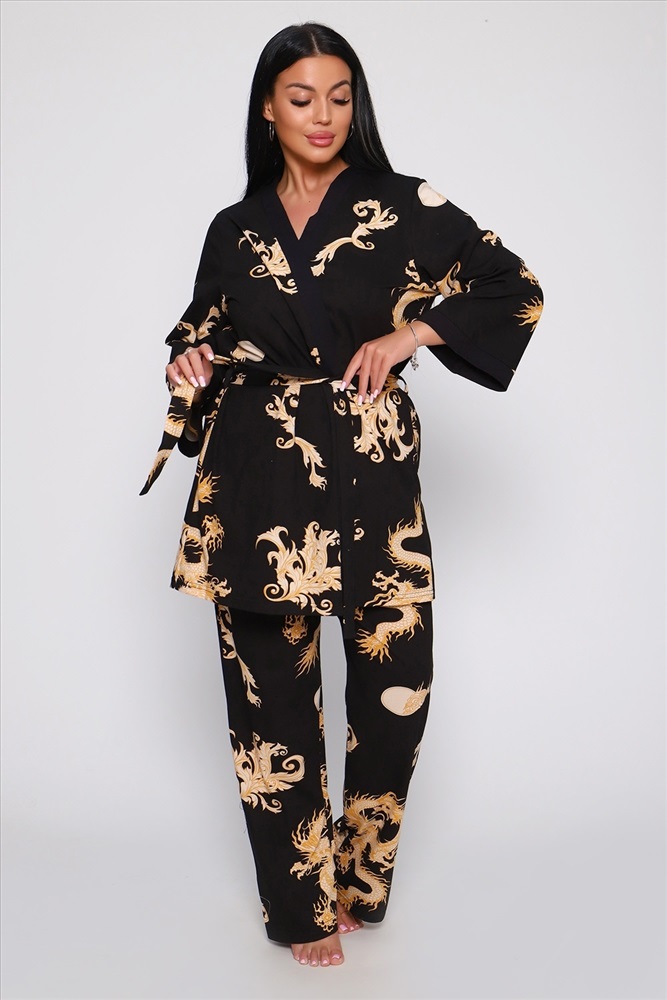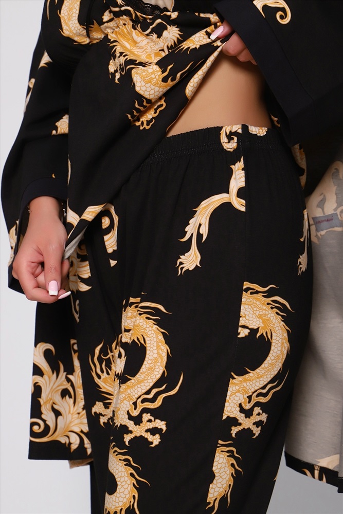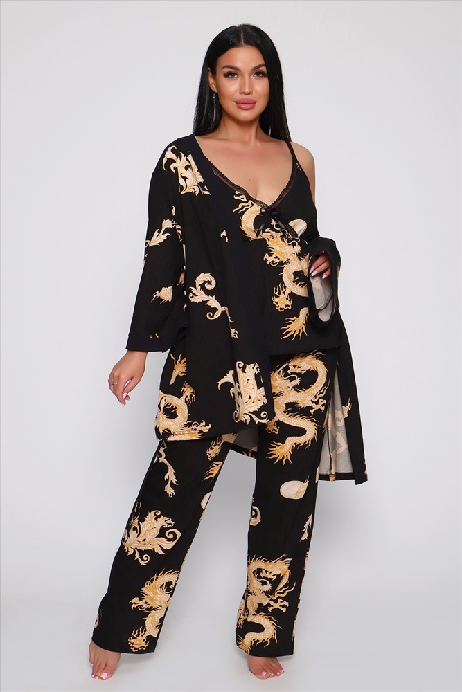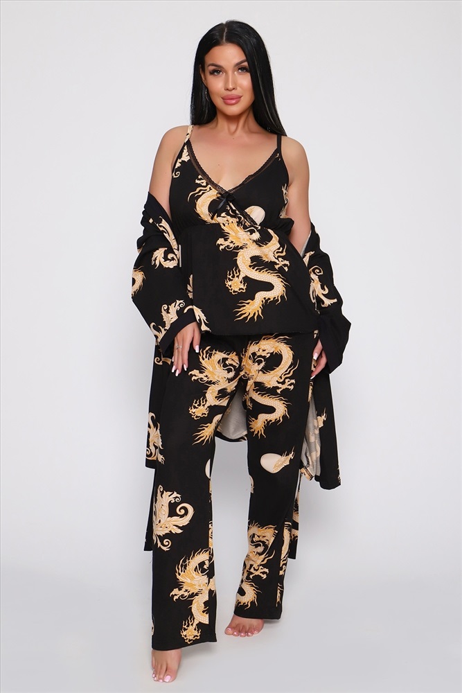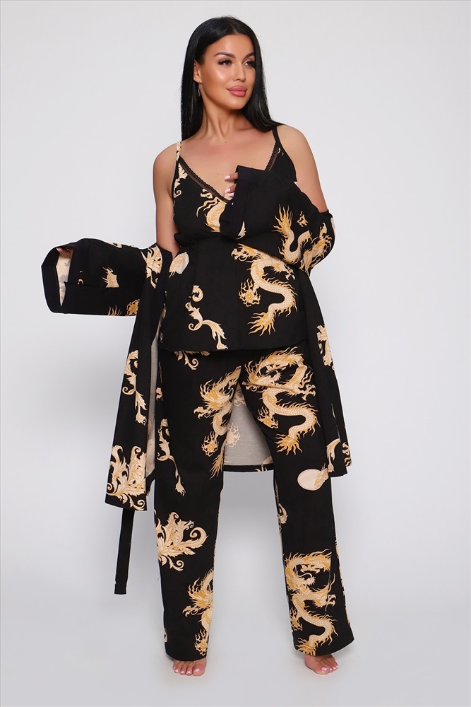 Застежка: на запах Роскошный комплект тройка с драконами в твоем доме. Состав и материал: Комплект выполнен из натурального хлопка, что обеспечивает комфорт, воздухопроницаемость и приятные тактильные ощущения. Элементы: Включает три предмета: топ на бретелях с кружевной отделкой, свободные брюки и халат с рукавом 3/4. Дизайн: Отличительная особенность принт драконы, который может быть выполнен в различных стилях, от минималистичных до ярких и детализированных. Размерный ряд: Изделие представлено в широком размерном ряде, что позволяет подобрать его для различных типов фигур.