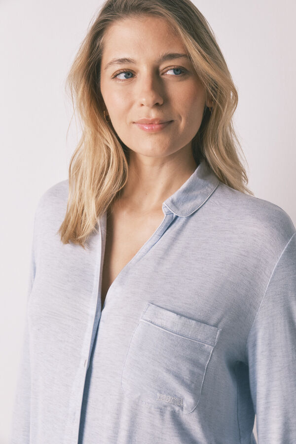 Pijama camisero de la colección maternity de manga larga y pantalón largo, confeccionado en viscosa de punto super soft. Súper suave y agradable al tacto. Parte de arriba con cuello camisero de tapeta y botones a tono, bolsillo en el pecho y vivo decorativo en el centro y puños. Pantalón con cintura crecedera de alta capacidad, con goma y puño con vivo a tono en el bajo. Las fibras LENZING™ ECOVERO™ se obtienen de madera y celulosa sostenibles, a partir de fuentes certificadas y controladas.