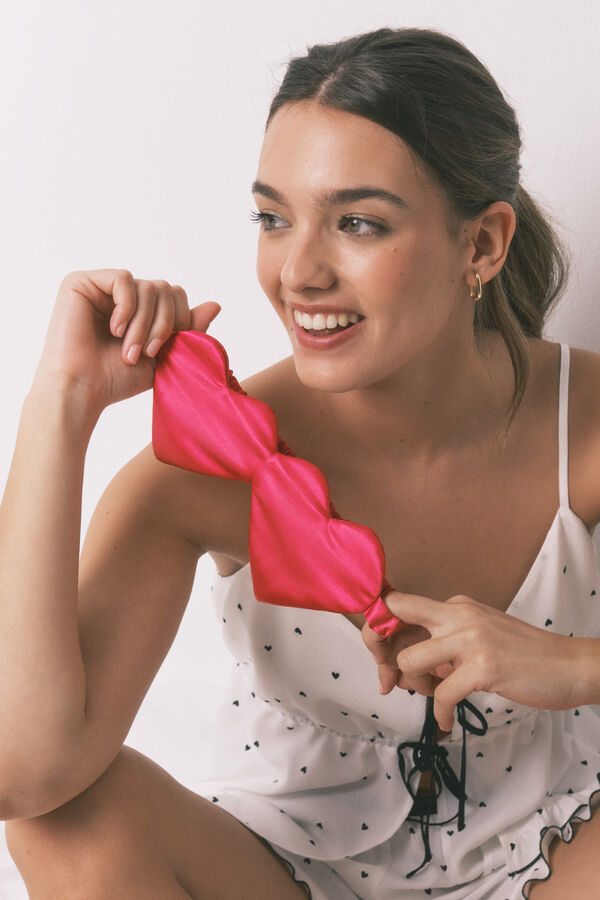 Pijama de tirantes y pantalón corto confeccionado con tejido dobby con estampado all over de corazones. Parte de arriba de tirantes con escote pico, abertura en el centro delantero con dos lanzadas y detalle de volante en el bajo. Short con cinturilla elástica y detalle de volantes en el bajo. Ideal para dormir o estar en casa con estilo.