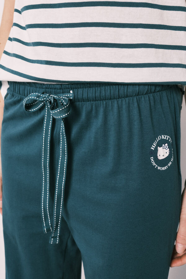 Pijama largo 100% algodón de Hello Kitty, ideal para fans de la famosa gatita. Perfecto para dormir o estar en casa con estilo. Camiseta de manga corta con cuello redondo y gráfico estampado. Pantalón largo de corte recto, color verde, con cinturilla elástica ajustable mediante cordón a tono. Al elegir nuestros productos de algodón, estás apoyando nuestra inversión en la iniciativa Better Cotton.