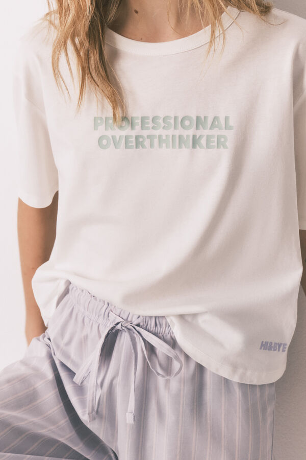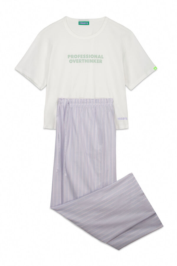 Pijama de manga corta y pantalón largo en tejido 100% algodón. Top liso con escote redondo, corte holgado y texto a contraste. Pantalón con estampación de rayas a contraste, cinturilla elástica y bolsillos a los laterales con detalle de bordado en el borde . Ideal para hacerte un total look.