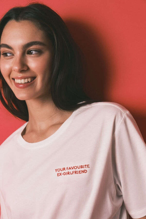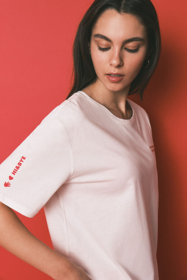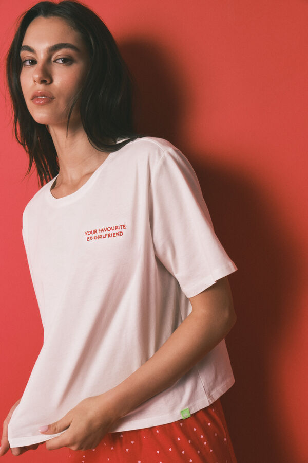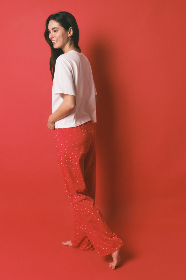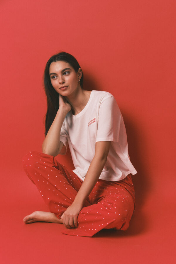 Pijama de manga corta y pantalón largo en tejido 100% algodón. Top liso con escote redondo y mensaje divertido. Pantalón con estampación en rojos y rosas y cinturilla elástica. Ideal para hacerte un total look.