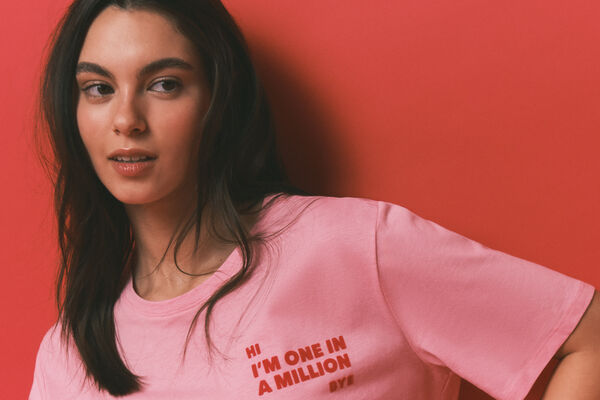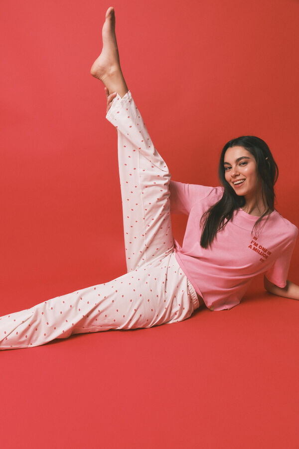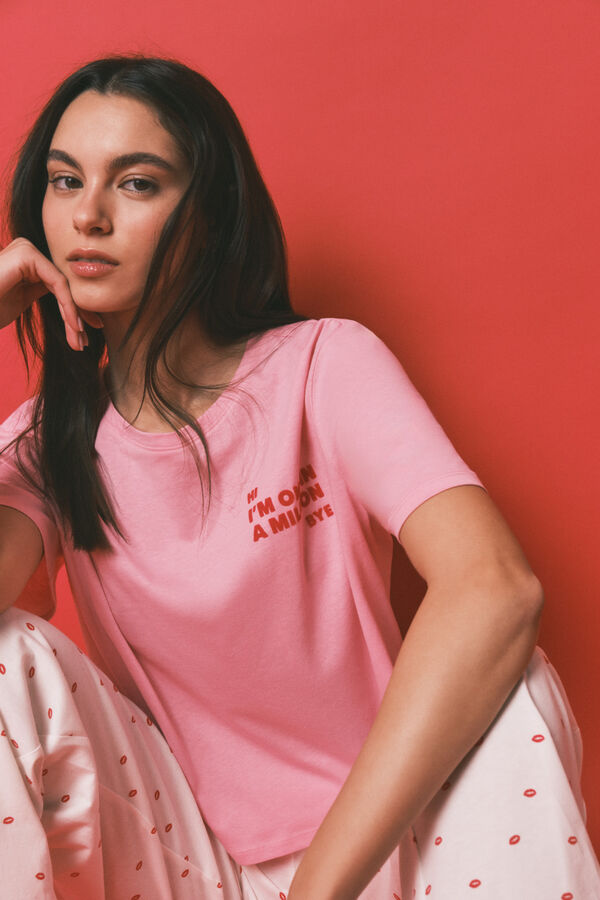 Pijama de manga corta y pantalón largo en tejido 100% algodón. Top liso con escote redondo y mensaje divertido. Pantalón con estampación en rojos y rosas y cinturilla elástica. Ideal para hacerte un total look.