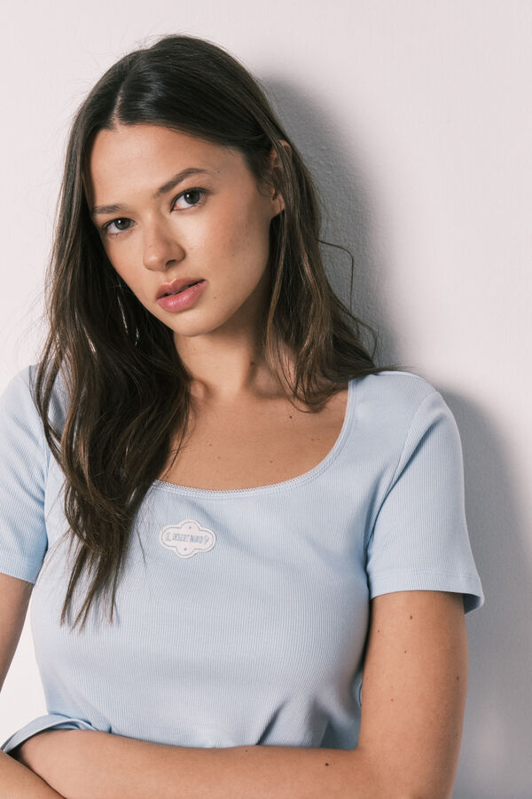 Pijama largo de algodón, de manga corta de algodón en canalé. Parte de arriba con escote cuadrado con detalles de encaje y un bordado en el centro pecho. Pantalón largo con estampado all over y cinturilla elástica ajustable mediante cordón a tono.