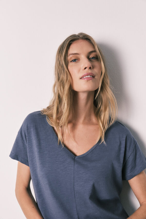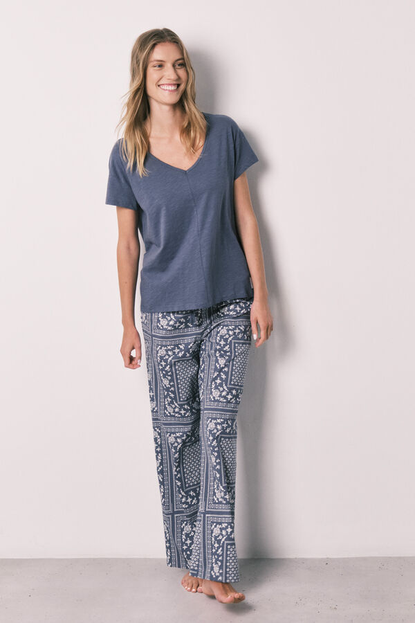 Pijama 100% algodón de manga corta y pantalón largo con estampado bandana súper tendencia. Muy ligero, ideal para dormir o estar en casa cómoda y con estilo. Parte de arriba con escote en pico y etiqueta en el lateral. Pantalón con cinturilla elástica regulable mediante cordón a tono.