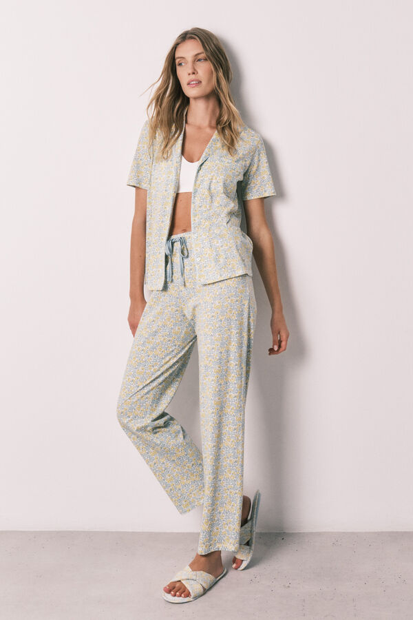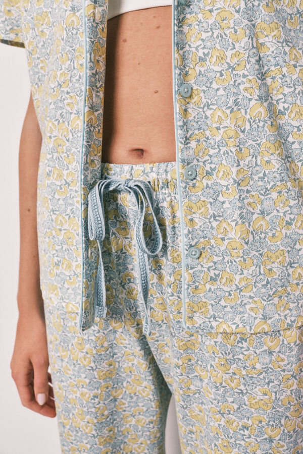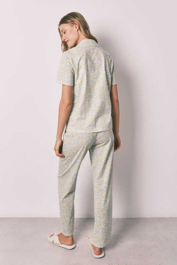 Pijama largo camisero 100% algodón, con estampado all over de florecitas tipo Liberty. Parte de arriba con cuello solapa y abotonadura en el centro delantero, mangas cortas y un bolsillo plastrón en el pecho. Pantalón largo con cinturilla elástica ajustable mediante cordón a tono.