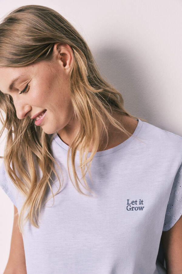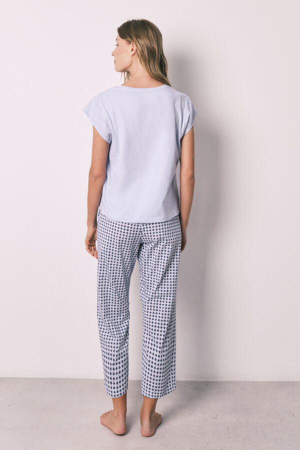Pijama de manga corta y pantalón. Top de algodón en color liso, cuello redondo y posicionado bordado en el pecho. Detalle de dobladillo en manga en claidad de bordado suizo. Pantalón de single jersey de algodón estampado, cinturilla regulable mediante cordón a tono.