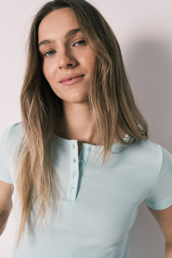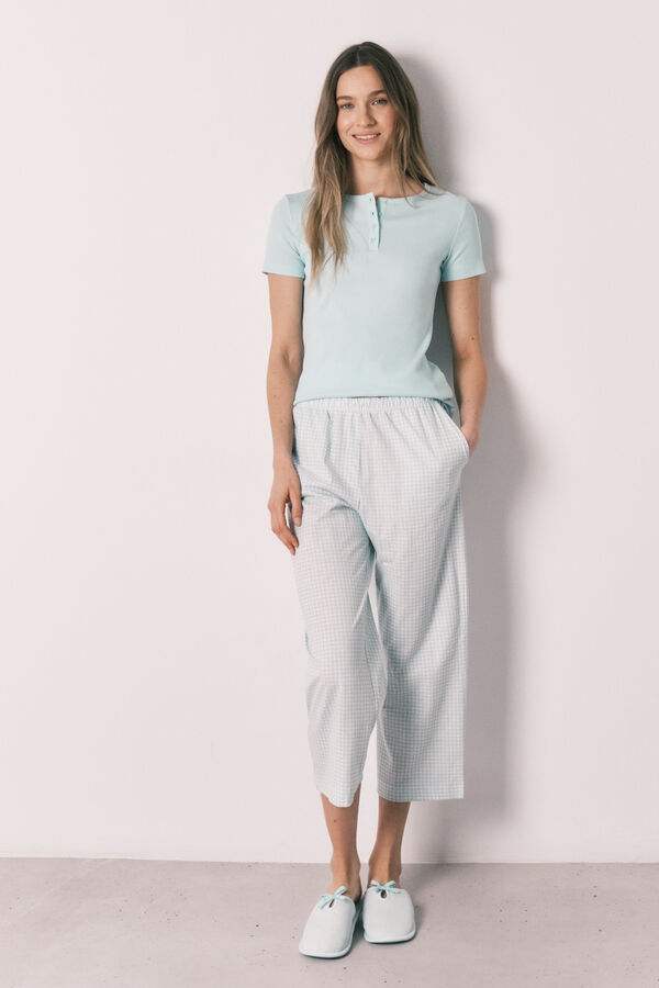 Pijama de suave viscosa, ideal para dormir o estar en casa cómoda y con tu toque personal de estilo. Parte de arriba de manga corta, confeccionada en tejido de rib, con escote redondo, detalle de tapeta con botones a tono y etiqueta decorativa. Pantalón de largo Capri, con estampado de cuadritos y bolsillo a contraste. Cinturilla elástica con botones a tono decorativos.