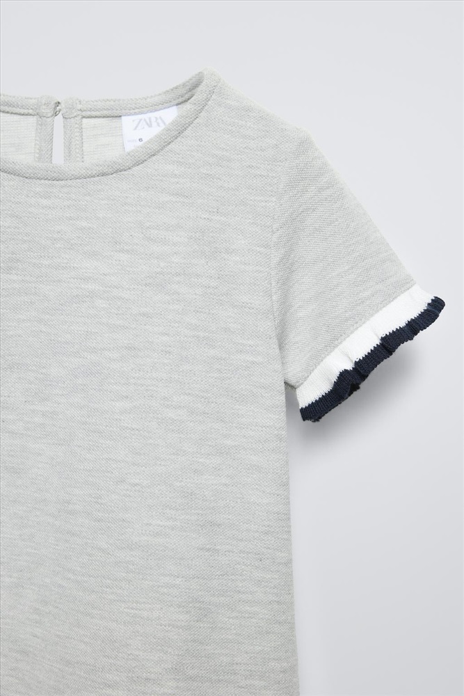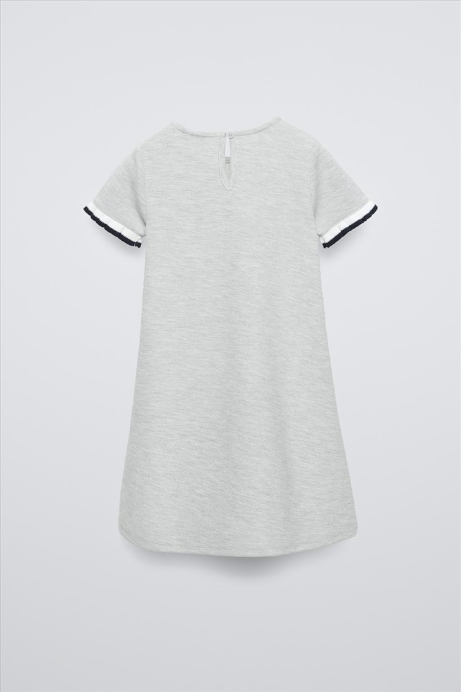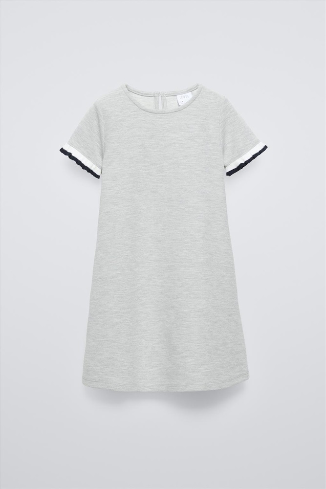 Dress with a round neck and short ruffled sleeves. Buttoned teardrop opening at the back. COMPOSITION, CARE & ORIGIN COMPOSITION OUTER SHELL MAIN FABRIC 62% polyester SLEEVES 99% cotton Which contains at least: OUTER SHELL MAIN FABRIC 62% RCS certified recycled polyester 38% OCS certified organically grown cotton CERTIFIED MATERIALS RCS CERTIFIED RECYCLED POLYESTER Nowadays, recycled polyester is mainly made from PET plastic waste. This is a type of plastic that is widely used in a variety of items, such as plastic bottles. Using recycled materials helps limit the production of virgin polyester fibre. It is certified to the Recycled Claim Standard (RCS), which verifies the recycled content and tracks it from source to final product. Certified by Intertek 193341 More information OCS CERTIFIED ORGANICALLY GROWN COTTON This fibre is produced using no artificial fertilisers or pesticides and is grown from seeds that have not been genetically modified. We are currently working with the Organic Content Standard (OCS) that monitors the process from the source to the end product. Certified by Intertek 193341 More information CARE Caring for your clothes is caring for the environment. Lower temperature washes and delicate spin cycles are gentler on garments and help to protect the colour, shape and structure of the fabric. Furthermore, they reduce the amount of energy used in care processes.