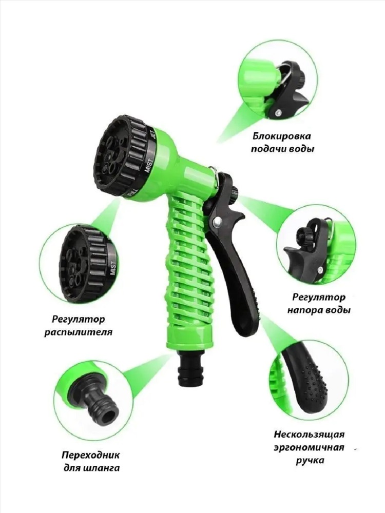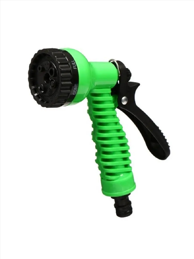 Тип товара: пистолет для полива Назначение: для дачи Представляем вашему вниманию универсальный поливочный пистолет, который станет надежным и многофункциональным помощником для полива растений. Этот поливочный пистолет имеет 7 режимов полива, которые включают струю, конусный поток, горизонтальную струю, душ, поток и туман. Благодаря такому разнообразию функций, этот пистолет не только обеспечит эффективный полив огорода, но также справится с поливом цветов и растений в комнате. Кроме того, этот поливочный пистолет является идеальным инструментом для мойки автомобиля или домашнего животного после прогулки. Его удобная форма и простое переключение режимов полива делают его очень удобным в использовании. Переключение режимов полива осуществляется круговым вращением верхнего регулятора, что даёт возможность менять режим без особых усилий, пистолет имеет удобную блокировку рукоятки. Таблица размеров и веса