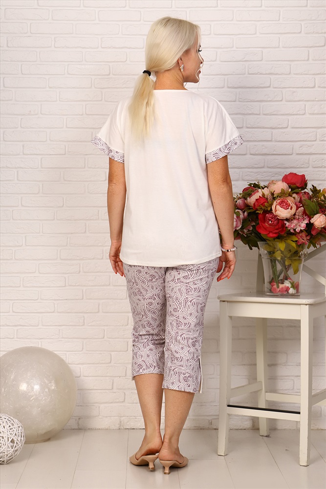 Стиль: домашний Удобная женская пижама из кулирки. Верх изделия выполнен из однотонной ткани. Футболка с округлым вырезом горловины обработанной окантовкой, линия плеча спущена, цельнокроеный рукав отделан манжетой, изделие украшено принтом. Капри длиной примерно до середины голени из ткани с рисунком с удобными глубокими карманами и притачным поясом, сбоку внизу брюк сделаны разрезы со шлицей. Пижама отлично подойдет для сна и отдыха.