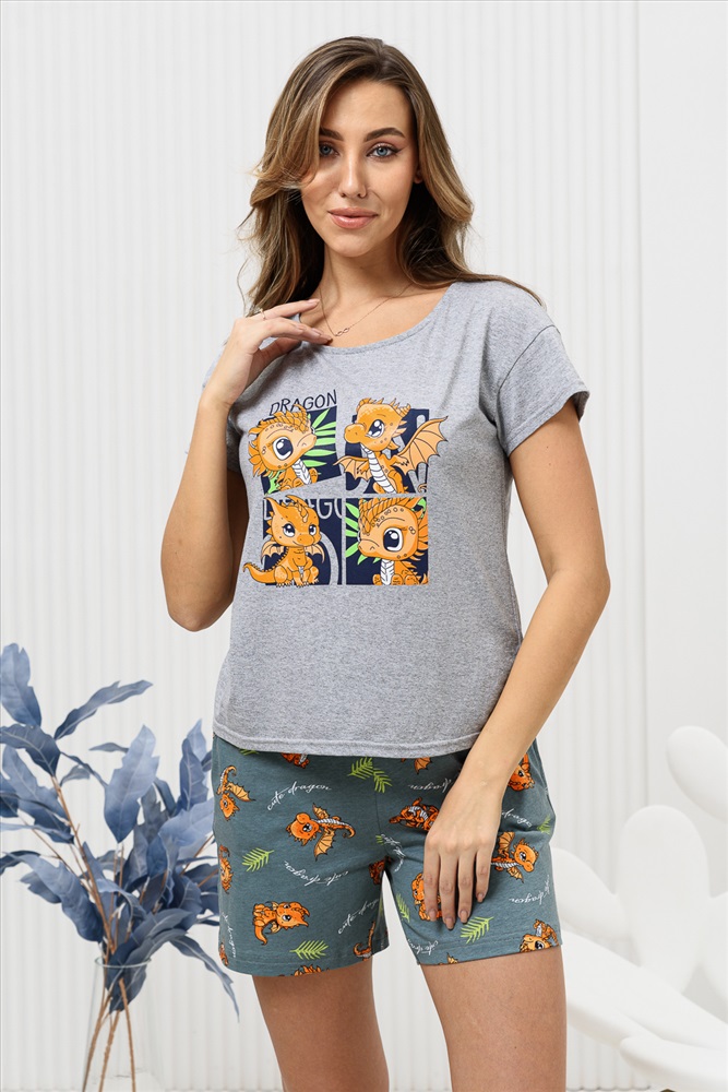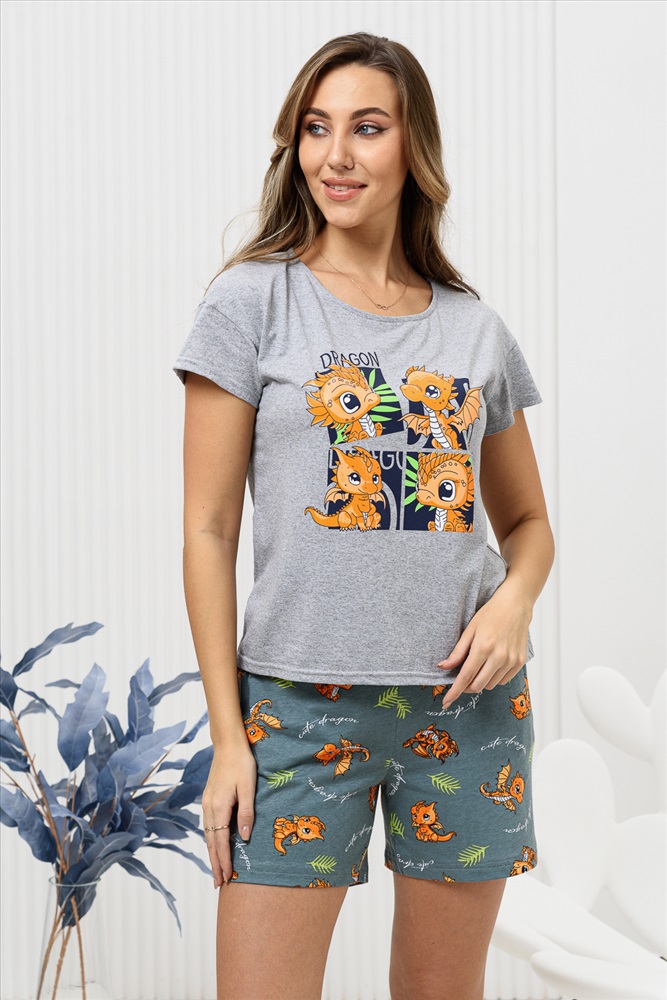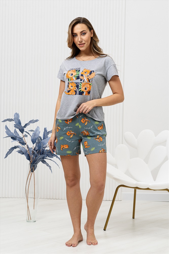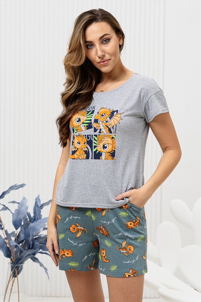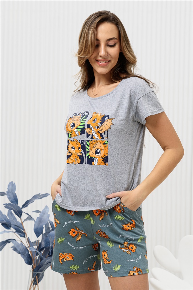 Стиль: домашний | молодежный Удобная и очень комфортная пижама с новогодней символикой. Футболка из кулирной ткани - меланж украшена ярким принтом с изображением очаровательных дракончиков - символом 2024 года. Рукав короткий, спущенная пройма, горловина обработана окантовкой и отстрочена, что придаёт изделию аккуратный и стильный вид. Шорты домашнего комплекта выполнены из полотна с рисунком, перекликающимся с принтом на футболке, имеют карманы. Комплект подойдёт как домашний костюм, и как изделие для сна, будет отличным подарком для ваших близких.